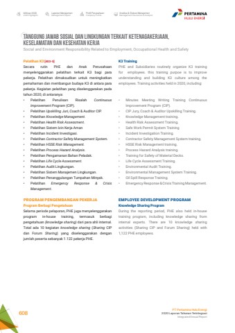 K3 Training PHE and Subsidiaries routinely organize K3 training for employees. this training purpoe is to improve understanding and building K3 culture among the employees. Training activities held in 2020, including:%u2022 Minutes Meeting Writing Training Continuous Improvement Program (CIP).%u2022 CIP Jury, Coach & Auditor Upskilling Training.%u2022 Knowledge Management training.%u2022 Health Risk Assessment Training.%u2022 Safe Work Permit System Training%u2022 Incident Investigation Training.%u2022 Contractor Safety Management System training.%u2022 HSSE Risk Management training.%u2022 Process Hazard Analysis training.%u2022 Training for Safety of Material Decks.%u2022 Life Cycle Assessment Training.%u2022 Environmental Audit Training.%u2022 Environmental Management System Training.%u2022 Oil Spill Response Training.%u2022 Emergency Response & Crisis Training Management.EMPLOYEE DEVELOPMENT PROGRAMKnowledge Sharing ProgramDuring the reporting period, PHE also held in-house training program, including knowledge sharing from internal experts. There are 10 knowledge sharing activities (Sharing CIP and Forum Sharing) held with 1,122 PHE employees.Pelatihan K3 [403-5]Secara rutin PHE dan Anak Perusahaan menyelenggarakan pelatihan terkait K3 bagi para pekerja. Pelatihan dimaksudkan untuk meningkatkan pemahaman dan membangun budaya K3 di antara para pekerja. Kegiatan pelatihan yang diselenggarakan pada tahun 2020, di antaranya:%u2022 Pelatihan Penulisan Risalah Continuous Improvement Program (CIP).%u2022 Pelatihan Upskilling Juri, Coach & Auditor CIP.%u2022 Pelatihan Knowledge Management.%u2022 Pelatihan Health Risk Assessment.%u2022 Pelatihan Sistem Izin Kerja Aman%u2022 Pelatihan Incident Investigasi.%u2022 Pelatihan Contractor Safety Management System.%u2022 Pelatihan HSSE Risk Management.%u2022 Pelatihan Process Hazard Analysis.%u2022 Pelatihan Pengamanan Bahan Peladak.%u2022 Pelatihan Life Cycle Assessment.%u2022 Pelatihan Audit Lingkungan.%u2022 Pelatihan Sistem Manajemen Lingkungan.%u2022 Pelatihan Penanggulangan Tumpahan Minyak.%u2022 Pelatihan Emergency Response & Crisis Management.PROGRAM PENGEMBANGAN PEKERJAProgram Berbagi Pengetahuan Selama periode pelaporan, PHE juga menyelenggarakan program in-house training, termasuk berbagi pengetahuan (knowledge sharing) dari para ahli internal. Total ada 10 kegiatan knowledge sharing (Sharing CIP dan Forum Sharing) yang diselenggarakan dengan jumlah peserta sebanyak 1.122 pekerja PHE.TANGGUNG JAWAB SOSIAL DAN LINGKUNGAN TERKAIT KETENAGAKERJAAN,KESELAMATAN DAN KESEHATAN KERJA Social and Environment Responsibility Related to Employment, Occupational Health and SafetyLaporan ManajemenManagement ReportProfil PerusahaanCompany ProfileAnalisa & Diskusi ManajemenManagement Discussion & AnalysisIkhtisar 20202020 HighlightsPT Pertamina Hulu Energi2020 Laporan Tahunan TerintegrasiIntegrated Annual Report 608