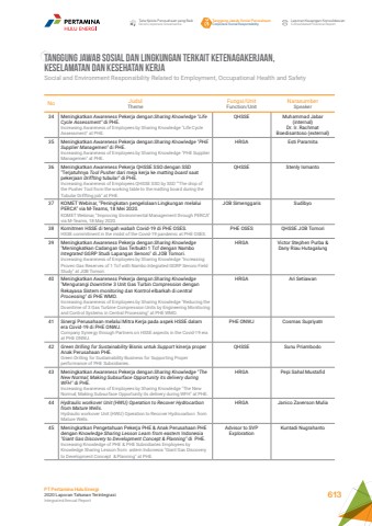No JudulThemeFungsi/UnitFunction/UnitNarasumberSpeaker34 Meningkatkan Awareness Pekerja dengan Sharing Knowledge \Cycle Assessment\Increasing Awareness of Employees by Sharing Knowledge \Assessment\QHSSE Muhammad Jabar (internal) Dr. Ir. Rachmat Boedisantoso (external)35 Meningkatkan Awareness Pekerja dengan Sharing Knowledge \Supplier Managemen\Increasing Awareness of Employees by Sharing Knowledge \Managemen\HRGA Esti Paramita36 Meningkatkan Awareness Pekerja QHSSE SSO dengan SSD \pekerjaan Driffting tubular\Increasing Awareness of Employees QHSSE SSO by SSD \the Pusher Tool from the working table to the matting board during the Tubular Driffting job\QHSSE Stenly Ismanto37 KOMET Webinar, %u201cPeningkatan pengelolaan Lingkungan melalui PERCA%u201d via M-Teams, 18 Mei 2020.KOMET Webinar, %u201cImproving Environmental Management through PERCA%u201d via M-Teams, 18 May 2020.JOB Simenggaris Sudibyo38 Komitmen HSSE di tengah wabah Covid-19 di PHE OSES.HSSE commitment in the midst of the Covid-19 pandemic at PHE OSES.PHE OSES QHSSE JOB Tomori39 Meningkatkan Awareness Pekerja dengan Sharing Knowledge\Integrated GGRP Studi Lapangan Senoro\Increasing Awareness of Employees by Sharing Knowledge \Proven Gas Reserves of 1 Tcf with Nambo Integrated GGRP Senoro Field Study\HRGA Victor Stephen Purba & Dany Riau Hutagalung40 Meningkatkan Awareness Pekerja dengan Sharing Knowledge\Rekayasa Sistem monitoring dan Kontrol elbarkah di central Processing\Increasing Awareness of Employees by Sharing Knowledge \Downtime of 3 Gas Turbine Compression Units by Engineering Monitoring and Control Systems in Central Processing\HRGA Ari Setiawan41 Sinergi Perusahaan melalui Mitra Kerja pada aspek HSSE dalam era Covid-19 di PHE ONWJ.Company Synergy through Partners on HSSE aspects in the Covid-19 era at PHE ONWJ.PHE ONWJ Cosmas Supriyatn42 Green Drilling for Sustainability Bisnis untuk Support kinerja proper Anak Perusahaan PHE.Green Drilling for Sustainability Business for Supporting Proper performance of PHE Subsidiaries.QHSSE Sunu Priambodo43 Meningkatkan Awareness Pekerja dengan Sharing Knowledge \New Normal; Making Subsurface Opportunity its delivery during WFH\Increasing Awareness of Employees by Sharing Knowledge \Normal; Making Subsurface Opportunity its delivery during WFH\HRGA Pepi Sahal Mustafid44 Hydraulic workover Unit (HWU) Operation to Recover Hydrocarbon from Mature Wells.Hydraulic workover Unit (HWU) Operation to Recover Hydrocarbon from Mature Wells.HRGA Janico Zaverson Mulia45 Meningkatkan Pengetahuan Pekerja PHE & Anak Perusahaan PHE dengan Knowledge Sharing Lesson Learn from eastern Indonesia \Increasing Knowledge of PHE & PHE Subsidiaries Employees by Knowledge Sharing Lesson from astern Indonesia \to Development Concept & Planning\Advisor to SVP ExplorationKuntadi NugrahantoTANGGUNG JAWAB SOSIAL DAN LINGKUNGAN TERKAIT KETENAGAKERJAAN,KESELAMATAN DAN KESEHATAN KERJA Social and Environment Responsibility Related to Employment, Occupational Health and SafetyTata Kelola Perusahaan yang BaikGood Corporate GovernanceTanggung Jawab Sosial PerusahaanCorporate Social ResponsibilityLaporan Keuangan KonsolidasianConsolidated Financial ReportPT Pertamina Hulu Energi2020 Laporan Tahunan TerintegrasiIntegrated Annual Report 613