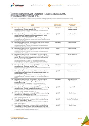 No JudulThemeFungsi/UnitFunction/UnitNarasumberSpeaker58 Meningkatkan Pengetahuan Pekerja QHSSE SSO dengan Sharing Session CLSR 05 Confined Space di PHE.Increasing Knowledge of QHSSE SSO Employees by Sharing Session CLSR 05 Confined Space at PHE.PHE ONWJ Stenly Ismanto &Dita Budi Wibawa59 Meningkatkan Pengetahuan Pekerja PHE & Anak Perusahaan PHE dengan Knowledge Sharing \Operation for Non Drilling Engineer\Increasing Knowledge of PHE & PHE Subsidiaris Employees by Knowledge Sharing \Drilling Engineer\QHSSE Lutfy Faluthi F60 Meningkatkan Pengetahuan Pekerja QHSSE SSO dengan Sharing Session CLSR 06 Lifting Operation di PHE.Increasing Knowledge of QHSSE SSO Employees by Sharing Session CLSR 06 Lifting Operation at PHE.PHE ONWJ Stenly Ismanto61 Meningkatkan Pengetahuan Pekerja QHSSE SSO dengan Sharing Session CLSR 07 Fit To Work di PHE.Increasing Knowledge of QHSSE SSO Employees by Sharing Session CLSR 07 Fit To Work at PHE.QHSSE Stenly Ismanto62 Meningkatkan Pengetahuan Pekerja PHE & Anak Perusahaan PHE dengan Knowledge Sharing \Minyak dengan Menciptakan Si Kethip di Turbine Generator Set Papa Flow Station PHE ONWJ\Increasing Knowledge of PHE & PHE Subsidiaris Employees by Knowledge Sharing \Kethip in the Papa Flow Station PHE ONWJ Turbine Generator Set\QHSSE Ongko Wibisono63 Meningkatkan Pengetahuan Pekerja QHSSE SSO dengan Sharing Session CLSR 08 Working at Height di PHE.Increasing Knowledge of QHSSE SSO Employee by Sharing Session CLSR 08 Working at Height at PHE.PHE ONWJ Stenly Ismanto64 Meningkatkan Pengetahuan Pekerja PHE & Anak Perusahaan PHE dengan Knowledge Sharing Horizontal Drilling as One of The Challenge di PHE ONWJ.Increasing Knowledge of PHE & PHE Subsidiaris Employees by Knowledge Sharing Horizontal Drilling as One of The Challenge at PHE ONWJ.QHSSE Taufan Arhammar65 Meningkatkan Pengetahuan Pekerja PHE & Anak Perusahaan PHE dengan Knowledge Bincang Photography: Next Level of Photography di PHE.Increasing Knowledge of PHE & PHE Subsidiaris Employees by Knowledge Photography Talk : Next Level of Photography at PHE.PHE ONWJ Rifky Widianto & Dwi Arifman66 Meningkatkan Pengetahuan Pekerja QHSSE SSO dengan Sharing Session CLSR 09 Personal Floatation Device di PHE.Increasing Knowledge of QHSSE SSO Employees by Sharing Session CLSR 09 Personal Floatation Device at PHE.QHSSE Ajad W. T.67 Meningkatkan Pengetahuan Pekerja QHSSE SSO dengan Sharing Session CLSR 10 System Overide di PHE.Increasing Knowledge of QHSSE SSO Employees by Sharing Session CLSR 10 System Overide at PHE.QHSSE Ghalia Yusra68 Meningkatkan Pengetahuan Pekerja melalui Knowledge Sharing\Increasing Knowledge of Employees by Knowledge Sharing \Asset Integrity\QHSSE Martino Faishal Saudi69 Meningkatkan Pengetahuan Pekerja melalui Knowledge Sharing\Increasing Knowledge of Employees by Knowledge Sharing \of Learning Program Syllabus Curriculum\QHSSE Ghalia YusraTANGGUNG JAWAB SOSIAL DAN LINGKUNGAN TERKAIT KETENAGAKERJAAN,KESELAMATAN DAN KESEHATAN KERJA Social and Environment Responsibility Related to Employment, Occupational Health and SafetyTata Kelola Perusahaan yang BaikGood Corporate GovernanceTanggung Jawab Sosial PerusahaanCorporate Social ResponsibilityLaporan Keuangan KonsolidasianConsolidated Financial ReportPT Pertamina Hulu Energi2020 Laporan Tahunan TerintegrasiIntegrated Annual Report 615