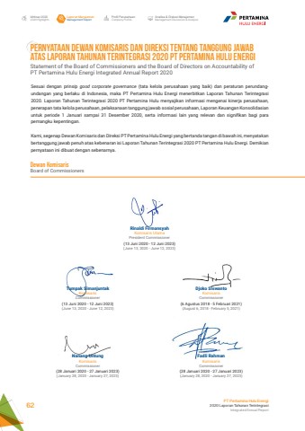 PERNYATAAN DEWAN KOMISARIS DAN DIREKSI TENTANG TANGGUNG JAWAB ATAS LAPORAN TAHUNAN TERINTEGRASI 2020 PT PERTAMINA HULU ENERGIStatement of the Board of Commissioners and the Board of Directors on Accountability of PT Pertamina Hulu Energi Integrated Annual Report 2020Sesuai dengan prinsip good corporate governance (tata kelola perusahaan yang baik) dan peraturan perundangundangan yang berlaku di Indonesia, maka PT Pertamina Hulu Energi menerbitkan Laporan Tahunan Terintegrasi 2020. Laporan Tahunan Terintegrasi 2020 PT Pertamina Hulu menyajikan informasi mengenai kinerja perusahaan, penerapan tata kelola perusahaan, pelaksanaan tanggung jawab sosial perusahaan, Laporan Keuangan Konsolidasian untuk periode 1 Januari sampai 31 Desember 2020, serta informasi lain yang relevan dan signifikan bagi para pemangku kepentingan.Kami, segenap Dewan Komisaris dan Direksi PT Pertamina Hulu Energi yang bertanda tangan di bawah ini, menyatakan bertanggung jawab penuh atas kebenaran isi Laporan Tahunan Terintegrasi 2020 PT Pertamina Hulu Energi. Demikian pernyataan ini dibuat dengan sebenarnya.Rinaldi FirmansyahKomisaris UtamaPresident Commissioner(13 Juni 2020 - 12 Juni 2023)(June 13, 2020 - June 12, 2023)Nanang UntungKomisaris Commissioner(28 Januari 2020 - 27 Januari 2023)(January 28, 2020 - January 27, 2023)Djoko SiswantoKomisarisCommissioner(6 Agustus 2018 - 5 Februari 2021)(August 6, 2018 - February 5, 2021)Fadli RahmanKomisarisCommissioner(28 Januari 2020 - 27 Januari 2023)(January 28, 2020 - January 27, 2023)Tumpak SimanjuntakKomisarisCommissioner(13 Juni 2020 - 12 Juni 2023)(June 13, 2020 - June 12, 2023)Dewan KomisarisBoard of CommissionersLaporan ManajemenManagement ReportProfil PerusahaanCompany ProfileAnalisa & Diskusi ManajemenManagement Discussion & AnalysisIkhtisar 20202020 HighlightsPT Pertamina Hulu Energi2020 Laporan Tahunan TerintegrasiIntegrated Annual Report 62