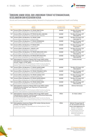 No JudulThemeFungsi/UnitFunction/UnitNarasumberSpeaker126 Komet Offline, KS Marathon: PC PROVE EMOTICON.Komet Offline, KS Marathon: PC PROVE EMOTICON.QHSSE The Best 25 Gugus CIP PHE 2020-13127 Komet Offline, KS Marathon: RT PROVE BLANG LANCANG.Komet Offline, KS Marathon: RT PROVE BLANG LANCANG.QHSSE The Best 25 Gugus CIP PHE 2020-14128 Komet Offline, KS Marathon: PC PROVE CRAB.Komet Offline, KS Marathon: PC PROVE CRAB.QHSSE The Best 25 Gugus CIP PHE 2020-15129 Komet Offline, KS Marathon: FT PROVE PERMADANI.Komet Offline, KS Marathon: FT PROVE PERMADANI.QHSSE The Best 25 Gugus CIP PHE 2020-16130 Komet Offline, KS Marathon: FT PROVE SKID.Komet Offline, KS Marathon: FT PROVE SKID.QHSSE The Best 25 Gugus CIP PHE 2020-17131 Komet Offline, KS Marathon: I PROVE VJAY.Komet Offline, KS Marathon: I PROVE VJAY.QHSSE The Best 25 Gugus CIP PHE 2020-18132 Komet Offline, KS Marathon: PC PROVE MEULIGOE ACEH.Komet Offline, KS Marathon: PC PROVE MEULIGOE ACEH.QHSSE The Best 25 Gugus CIP PHE 2020-19133 Komet Offline, KS Marathon: RT PROVE REPLIKASI DNA.Komet Offline, KS Marathon: RT PROVE REPLIKASI DNA.QHSSE The Best 25 Gugus CIP PHE 2020-20134 Meningkatkan Awareness Pekerja PHE Fungsi HSSE melalui Sharing Session tentang \Rumah Tinggal\Increasing Awareness of PHE Employees HSSE Function by Sharing Session \QHSSE Andrias Atmoko135 Komet Offline, KS Marathon: FT PROVE SUPER DOME.Komet Offline, KS Marathon: FT PROVE SUPER DOME.QHSSE The Best 25 Gugus CIP PHE 2020-21136 Komet Offline, KS Marathon: PC PROVE PENABUR CINTA.Komet Offline, KS Marathon: PC PROVE PENABUR CINTA.QHSSE The Best 25 Gugus CIP PHE 2020-22137 Komet Offline, KS Marathon: PC PROVE GARASI TOPI.Komet Offline, KS Marathon: PC PROVE GARASI TOPI.QHSSE The Best 25 Gugus CIP PHE 2020-23138 Komet Offline, KS Marathon: RT PROVE SUPER BRAVO.Komet Offline, KS Marathon: RT PROVE SUPER BRAVO.QHSSE The Best 25 Gugus CIP PHE 2020-24139 Komet Offline, KS Marathon: PC PROVE EWES EWES.Komet Offline, KS Marathon: PC PROVE EWES EWES.QHSSE The Best 25 Gugus CIP PHE 2020-25140 Meningkatkan Awareness Pekerja PHE Fungsi HRGA melalui Sharing Session tentang \Performance\Increasing Awareness of PHE Employees HRGA Function by Sharing Session \QHSSE Hilmma Hermawan141 Meningkatkan Awareness Pekerja PHE Fungsi HSSE melalui Sharing Session tentang %u201dPractical Guide to Effectively Responding to Oil & Chemical Spill on Land\Increasing Awareness of PHE Employees HSSE Function by Sharing Session %u201dPractical Guide to Effectively Responding to Oil & Chemical Spill on Land\HRGA M. Abdul Jabbar142 Meningkatkan Awareness Pekerja PHE melalui Sharing Session tentang \Increasing Awareness of PHE Employees by Sharing Session \Creation Law\HRGA Menteri Tenaga Kerja RI:Dr. Ida Fauziyah, M.Si dan Dirjen Ketenagakerjaan RIMinister of Manpower Republic of Indonesia :Dr. Ida Fauziyah, M.Si and Directorate General of Manpower Republic of IndonesiaTANGGUNG JAWAB SOSIAL DAN LINGKUNGAN TERKAIT KETENAGAKERJAAN,KESELAMATAN DAN KESEHATAN KERJA Social and Environment Responsibility Related to Employment, Occupational Health and SafetyLaporan ManajemenManagement ReportProfil PerusahaanCompany ProfileAnalisa & Diskusi ManajemenManagement Discussion & AnalysisIkhtisar 20202020 HighlightsPT Pertamina Hulu Energi2020 Laporan Tahunan TerintegrasiIntegrated Annual Report 620