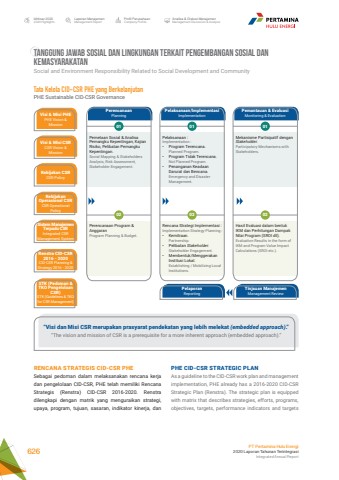 TANGGUNG JAWAB SOSIAL DAN LINGKUNGAN TERKAIT PENGEMBANGAN SOSIAL DAN KEMASYARAKATANSocial and Environment Responsibility Related to Social Development and CommunityPHE CID-CSR STRATEGIC PLANAs a guideline to the CID-CSR work plan and management implementation, PHE already has a 2016-2020 CID-CSR Strategic Plan (Renstra). The strategic plan is equipped with matrix that describes strategies, efforts, programs, objectives, targets, performance indicators and targets Tata Kelola CID-CSR PHE yang BerkelanjutanPHE Sustainable CID-CSR Governance Pemetaan Sosial & Analisa Pemangku Kepentingan, Kajian Risiko, Pelibatan Pemangku Kepentingan.Social Mapping & Stakeholders Analysis, Risk Assessment, Stakeholder Engagement.Perencanaan Program & AnggaranProgram Planning & Budget.Pelaksanaan :Implementation :%u2022 Program Terencana.Planned Program.%u2022 Program Tidak Terencana.Not Planned Program.%u2022 Penanganan Keadaan Darurat dan Bencana.Emergency and Disaster Management.Rencana Strategi Implementasi :Implementation Strategy Planning :%u2022 Kemitraan.Partnership.%u2022 Pelibatan Stakeholder.Stakeholder Engagement.%u2022 Membentuk/Menggerakan Institusi Lokal.Establishing / Mobilizing Local Institutions.Mekanisme Partisipatif dengan Stakeholder.Participatory Mechanisms with Stakeholders.Hasil Evaluasi dalam bentuk IKM dan Perhitungan Dampak Nilai Program (SROI dll).Evaluation Results in the form of IKM and Program Value Impact Calculations (SROI etc.).PerencanaanPlanningPelaksanaan/ImplementasiImplementationPemantauan & EvaluasiVisi & Misi PHE Monitoring & EvaluationPHE Vision & MissionVisi & Misi CSRCSR Vision & MissionKebijakan Operasional CSRCSR Operational PolicyRenstra CID-CSR2016 - 2020CID-CSR Planning & Strategy 2016 - 2020STK (Pedoman & TKO Pengelolaan CSR)STK (Guidelines & TKO for CSR Management)Sistem Manajemen Terpadu CSRIntegrated CSR Management SystemKebijakan CSRCSR Policy010201020102PelaporanReportingTinjauan ManajemenManagement Review%u201cVisi dan Misi CSR merupakan prasyarat pendekatan yang lebih melekat (embedded approach).%u201d%u201cThe vision and mission of CSR is a prerequisite for a more inherent approach (embedded approach).%u201dRENCANA STRATEGIS CID-CSR PHESebagai pedoman dalam melaksanakan rencana kerja dan pengelolaan CID-CSR, PHE telah memiliki Rencana Strategis (Renstra) CID-CSR 2016-2020. Renstra dilengkapi dengan matrik yang menguraikan strategi, upaya, program, tujuan, sasaran, indikator kinerja, dan Laporan ManajemenManagement ReportProfil PerusahaanCompany ProfileAnalisa & Diskusi ManajemenManagement Discussion & AnalysisIkhtisar 20202020 HighlightsPT Pertamina Hulu Energi2020 Laporan Tahunan TerintegrasiIntegrated Annual Report 626