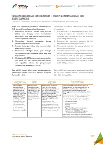 TANGGUNG JAWAB SOSIAL DAN LINGKUNGAN TERKAIT PENGEMBANGAN SOSIAL DAN KEMASYARAKATANSocial and Environment Responsibility Related to Social Development and Communityfor each year. PHE and its subsidiaries CID-CSR targets in five aspects: 1. Build the capacity of Human Resources (HR), which is trying to improve the capabilities of human resources, both internally (workers) and externally (surrounding communities). 2. Strengthen the community economy, by the empowerment of community economic 3. Environment protection, by paying attention to environment sustainability. 4. Strengthen social relations, by maintain harmony with the surrounding community to prevent conflicts. 5. 5. Conduct CID-CSR by the good governance implementation, increase internal understanding and capabilities and develop the framework, as well as CID-CSR governance.Currently PHE is in the process of updating and compiling the 2021-2025 Strategic Plan as a continuation of the 2016-2020 Strategic Plan.target pada setiap tahun pelaksanaan. Sasaran CID-CSR PHE dan Anak Perusahaan meliputi lima aspek:1. Membangun kapasitas Sumber Daya Manusia (SDM), yaitu berupaya untuk meningkatkan kemampuan SDM, baik internal (pekerja) maupun eksternal (masyarakat sekitar).2. Memperkuat ekonomi masyarakat, berupa pemberdayaan ekonomi komunitas.3. Proteksi lingkungan hidup, yaitu memperhatikan kelestarian lingkungan.4. Memperkuat hubungan sosial, yaitu menjaga harmonisasi dengan masyarakat sekitar agar tidak terjadi konflik.5. Menjalankan CID-CSR dengan mengimplementasikan tata kelola yang baik, meningkatkan pemahaman dan kapabilitas internal dan pengembangan framework, serta tata kelola CID-CSR.Saat ini PHE tengah dalam proses pembaharuan dan penyusunan Renstra 2021%u20132025 sebagai kelanjutan Renstra 2016-2020. Strategi 2016Strategy 2016-2020UpayaEffortsTarget 2020Target 2020Pencapaian 2020Achievements 2020Meningkatkan pemahaman dan kapabilitas internal mengenai CIDCSR dan pengembangan framework, serta tata kelola CID-CSR yang mengadopsi ISO 26000 dan PROPER.Increasing internal understanding of and capabilities on CIDCSR and framework development, as well as CID-CSR good governance adoptingISO 26000 and PROPER.Meningkatkan pemahaman dan kapabilitas internal mengenai CID-CSR adopsi ISO 26000.Increasing internal understanding of and capabilities on CID-CSR adopting ISO 26000.Pelatihan dan workshop CID-CSR dalam bidang terkait penerapan Pedoman ISO 26000, Sustainable Development Goals (SDGs)/Tujuan Pembangunan Berkelanjutan dan mendukung PROPER di Perusahaan minimal 3 (tiga) kali dalam setahun.CID-CSR training and workshops in areas related to the implementation of ISO 26000 Guidelines, Sustainable Development Goals (SDGs) and supporting PROPER in companies at least 3 (three) times a year.Terlaksananya 6x peningkatan kapasitas mengenai CID-CSR bagi pengelola CID-CSR PHE dan Anak Perusahaan PHE melalui pelatihan in-house dan workshop yang diselenggarakan secara virtual/daring, dalam topik:The implementation of 6 times capacity building on CID-CSR for CID-CSR PHE managers and PHE subsidiaries through in-house training and workshops held virtually / online, in the topics:%u2022 Tata Kelola Comdev.Comdev Governance.%u2022 PROPER.PROPER.%u2022 Tujuan Pembangunan Berkelanjutan.Sustainable Development Goals.%u2022 Implementasi CID-CSR berkelanjutan.CID-CSR Sustainable Implementation.Pengukuran Social Return on Investment (SROI)Social Return on Investment (SROI) Measurement.Tata Kelola Perusahaan yang BaikGood Corporate GovernanceTanggung Jawab Sosial PerusahaanCorporate Social ResponsibilityLaporan Keuangan KonsolidasianConsolidated Financial ReportPT Pertamina Hulu Energi2020 Laporan Tahunan TerintegrasiIntegrated Annual Report 627