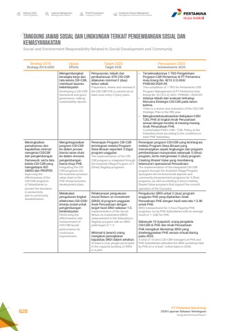 TANGGUNG JAWAB SOSIAL DAN LINGKUNGAN TERKAIT PENGEMBANGAN SOSIAL DAN KEMASYARAKATANSocial and Environment Responsibility Related to Social Development and CommunityStrategi 2016Strategy 2016-2020UpayaEffortsTarget 2020Target 2020Pencapaian 2020Achievements 2020Mengembangkan kerangka kerja dan tata kelola CID-CSR,membuat laporan keberlanjutan.Developing a CID-CSR framework and good governance, makingsustainability reports.Penyusunan, telaah dan pembaharuan STK CID-CSR dilakukan minimal 2 (dua) tahun sekali.Preparation, review and renewal of the CID-CSR STK is carried out at least once every 2 (two) years.%u2022 Terselesaikannya 1 TKO Pengelolaan Program CSR Pertamina di PT Pertamina Hulu Energi No. B(10.3.2)-004/PHE040/2020-S9.The completion of 1 TKO for Pertamina's CSR Program Management at PT Pertamina Hulu Energi No. B (10.3.2) -004 / PHE040 / 2020-S9.%u2022 Adanya telaah dan evaluasi terhadap Rencana Strategis CID-CSR pada tahun kelima.There is a review and evaluation of the CID-CSR Strategic Plan in the fifth year.%u2022 Mengkontekstualisasikan Kebijakan CSR/TJSL PHE di tingkat Anak Perusahaan sesuai dengan kondisi di masing-masing Anak Perusahaan PHE.Contextualize PHE's CSR / TJSL Policy at the Subsidiary level according to the conditions in each PHE Subsidiary.Meningkatkan pemahaman dan kapabilitas internal mengenai CIDCSR dan pengembangan framework, serta tata kelola CID-CSR yang mengadopsi ISO 26000 dan PROPER.Improving the effectiveness of theCID-CSR programs of Subsidiaries to prevent the decrease in productivity due to community dissatisfaction.Mengintegrasikan program CID-CSRke dalam proses bisnis/value chain ke dalam rencana pengembangan bisnis Grup PHE.Integrating the CIDCSR programs into the business process/value chain in the PHE Group business development plans.Penerapan Program CID-CSR terintegrasi melalui Program Desa Binaan sejumlah 3 (tiga) program unggulan.The implementation of the CIDCSR program is integrated through the Assisted Village Program of 3 (three) flagship programs.Penerapan program CID-CSR yang terintegrasi melalui Program Desa Binaan yang mensinergikan aspek lingkungan dan program pemberdayaan masyarakat sebanyak 5 (lima) program, serta menginisiasi 2 (dua) program Creating Shared Value yang mendukung kelancaran operasional Perusahaan.The implementation of the integrated CID-CSR program through the Assisted Village Program synergizes the environmental aspects and community empowerment programs for 5 (five) programs, as well as initiating 2 (two) Creating Shared Value programs that support the smooth operation of the Company.Melakukan pengukuran tingkat efektivitas CID-CSR/kinerja sosial untuk pengembangan berkelanjutan.Performing the effectiveness rate measurement of CID-CSR/social performance for continuousimprovement.Pelaksanaan pengukuranSocial Return on Investment(SROI) di program unggulan Anak Perusahaan dengan target hasil SROI sebesar 1:2.Implementation of the Social Return on Investment (SROI) measurement in the Subsidiary's flagship program with an SROI yield target of 1: 2.Minimal 6 (enam) orang mengikuti peningkatan kapasitas SROI dalam setahun.At least 6 (six) people participate in the capacity building of SROI in a year.Pengukuran SROI untuk 2 (dua) program unggulan PHE yang dijalankan Anak Perusahaan PHE dengan hasil rata-rata 1:5.80 untuk PHE.SROI measurement for 2 (two) flagship PHE programs run by PHE Subsidiaries with an average result of 1: 5.80 for PHE.Sebanyak 10 (sepuluh) orang pengelola CID-CSR di PHE dan Anak Perusahaan PHE mengikuti Workshop SROI yang diselenggarakan PHE secara virtual/daring pada 2020.A total of 10 (ten) CID-CSR managers at PHE and PHE Subsidiaries attended the SROI workshop held by PHE on a virtual / online basis in 2020.Laporan ManajemenManagement ReportProfil PerusahaanCompany ProfileAnalisa & Diskusi ManajemenManagement Discussion & AnalysisIkhtisar 20202020 HighlightsPT Pertamina Hulu Energi2020 Laporan Tahunan TerintegrasiIntegrated Annual Report 628