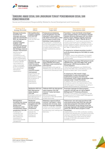 TANGGUNG JAWAB SOSIAL DAN LINGKUNGAN TERKAIT PENGEMBANGAN SOSIAL DAN KEMASYARAKATANSocial and Environment Responsibility Related to Social Development and CommunityStrategi 2016Strategy 2016-2020UpayaEffortsTarget 2020Target 2020Pencapaian 2020Achievements 2020Menjaga kontinuitas komitmen dan dukungan yang kuat pada level shareholder, BOD, dan Manajemen atas berbagai program unggulan CIDCSR untuk mendapat pengakuan yang semakin positif dari lembaga nasional maupun internasional.Maintaining the continuity of commitment to and strong support on the levels of shareholders, BOD, and Management of various CIDCSR main programs to obtain increasingly positive recognition from national and internationalorganizations.Mempublikasikan program unggulan CID-CSR PHE.Publishing the PHE CID-CDR main programs.Pembuatan/produktivitas profil pengelolaan CID-CSR sebanyak 2 (dua) publikasi baik dalam bentuk buku, artikel jurnal maupun booklet yang diterbitkan media eksternal.The production / productivity of the CID-CSR management profile is 2 (two) publications in the form of books, journal articles and booklets published by external media.Penerbitan 1 buku Seri Berdiri Untuk Negeri tahun keempat dalam versi bilingual berjudul %u2018Berjalan Bersama, Memupuk Asa%u2019 dan dalam Bahasa Inggris %u2018Walking Together, Nurturing Hope%u2019 dengan No. ISBN: 9-786239-501617.The publication of 1 book Series standing for the country in the fourth year in a bilingual version entitled 'Walking Together, Cultivating Asa' and in English 'Walking Together, Nurturing Hope' with No. ISBN: 9-786239-501617.Di samping itu, terdapat penerbitan booklet 1 profil Ekowisata Mangrove PHE WMO di media nasional.In addition, there is the publication of a booklet 1 profile of Ecotourism Mangrove PHE WMO in national media.Mendukung program CID-CSR Anak Perusahan untuk mendapatkan pengakuanlembaga nasional maupun internasional.Supporting the CIDCSR programs of Subsidiaries to obtain the recognition of national andinternational organizations.Mendapat pengakuran melalui Ajang PROPER serta ajang CSR dalam skala nasional dan internasional.Received approval through the PROPER event and CSR events on a national and international scale.Tiga (3) Anak Perusahaan PHE berhasil meraih PROPER Emas, yaitu PHE WMO, PHE Jambi Merang dan JOB Pertamina-Medco E&P Tomori Sulawesi.Three (3) PHE Subsidiaries won PROPER Gold, namely PHE WMO, PHE Jambi Merang and JOB Pertamina-Medco E&P Tomori Sulawesi.Di samping itu, PHE meraih 3 (tiga) penghargaan di skala internasional atas implementasi program CID-CSR Anak Perusahaaan, serta 3 (tiga) penghargaan skala nasional untuk 3 Anak Perusahaan. In addition, PHE won 3 (three) awards on an international scale for the implementation of the CID-CSR program for its Subsidiaries, as well as 3 (three) national awards for 3 Subsidiaries.Melibatkan BOD dan BOC/Manajemen dalam Kegiatan CID-CSR.Involving the BOD and BOC/Management in CID-CSR Activities.Pelibatan BOD dan Manajemen dalam kegiatan CID-CSR minimal 1 (satu) kali dalam setahun.BOD and Management involvement in CID-CSR activities at least once a year.Kunjungan lapangan ke lokasi program unggulan CID-CSR oleh VP CSR & SMEPP Management PT Pertamina (Persero).Field visit to the location of the flagship CID-CSR program by the VP of CSR & SMEPP Management of PT Pertamina (Persero).Meningkatkan koordinasi dan sinergi antara PHE Holding dengan AnakPerusahaan untuk menyelaraskan dalam pengelolaan CID-CSR.Increasing the coordination andsynergy between PHE Holding and Subsidiaries in harmonizing CIDCSRmanagement.Melakukan pertemuan antara pengelola CID-CSR di PHE Holding dengan AnakPerusahaan.Holding meetings between theCID-CSR at PHE Holding andSubsidiaries.Melakukan rapat koordinasi minimal 1 kali dalam 1 tahun (evaluasi dan rencana), rapat kerja dan kunjungan lapangan.Conduct coordination meetings at least once a year (evaluation and planning), work meetings and field visits.Pelaksanaan satu kali rapat koordinasi CSR untuk perencanaan kerja 2020 dan satu kali rapat kerja penguatan tata kelola CID-CSR Anak Perusahaan secara daring/virtual dan kunjungan lapangan oleh pejabat penanggung jawab CID-CSR ke lokasi program 2 Anak Perusahaan.Implementation of one CSR coordination meeting for 2020 work planning and one online/virtual work meeting to strengthen the CID-CSR governance of the Subsidiary and a field visit by the officer in charge of CID-CSR to the location of the 2 Subsidiary program.Tata Kelola Perusahaan yang BaikGood Corporate GovernanceTanggung Jawab Sosial PerusahaanCorporate Social ResponsibilityLaporan Keuangan KonsolidasianConsolidated Financial ReportPT Pertamina Hulu Energi2020 Laporan Tahunan TerintegrasiIntegrated Annual Report 629