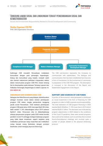 TANGGUNG JAWAB SOSIAL DAN LINGKUNGAN TERKAIT PENGEMBANGAN SOSIAL DAN KEMASYARAKATANSocial and Environment Responsibility Related to Social Development and CommunityThe CSR sub-function represents the Company to communicate with stakeholders. The dialogue and communication that has been established have become a form of mechanism for the involvement of community in preparation of the CSR PHE program. The description is conveyed in the discussion of the Report and Stakeholder Engagement in this Report.SUPPORT AND SOURCES OF CSR FUNDSA portion of the economic value generated is distributed as social investment in the form of financing for CSR programs in order to fulfill corporate social responsibility. The total realization of CSR program financing in 2020 reached Rp24.98 billion, 11.76% lower than in 2019 which reached Rp28.31 billion. The decrease was motivated by program adjustments in 2020 related to the conditions of the Covid-19 pandemic, there were several programs that could not be realized, such as activities that involved face-to-face/physical meetings and involved quite a number of people related to the physical distancing protocol.Direktur UtamaPresident DirectorCorporate SecretaryCorporate SecretaryCompliance & GCG Manager Media & Relations Manager Community Involvement & Development ManagerStruktur Organisasi CSR PHEPHE CSR Organization StructureSubfungsi CSR mewakili Perusahaan melakukan komunikasi dengan para pemangku kepentingan. Dialog dan komunikasi yang terjalin, menjadi salah satu bentuk mekanisme pelibatan masyarakat sekitar dalam merumuskan program CSR PHE. Uraian tentang hal ini disampaikan pada bahasan Tentang Laporan dan Pelibatan Pemangku Kepentingan di dalam Laporan ini. [102-33][102-34]DUKUNGAN DAN SUMBER DANA CSRSebagian dari Nilai Ekonomi yang didapat, didistribusikan sebagai investasi sosial dalam bentuk pembiayaan program CSR dalam rangka pemenuhan tanggung jawab sosial Perusahaan. Total realisasi pembiayaan program CSR pada tahun 2020 mencapai Rp24.98 miliar, lebih rendah 11,76% dibandingkan tahun 2019 sebesar Rp28,31 miliar. Penurunan nilai ini dilatarbelakangi adanya penyesuaian program pada 2020 terkait kondisi pandemi Covid-19 sehingga terdapat beberapa program yang tidak dapat terealisasi, seperti kegiatan yang melibatkan pertemuan tatap muka/fisik dan melibatkan cukup banyak orang (berkaitan dengan protokol kesehatan untuk menjaga physical distancing).Laporan ManajemenManagement ReportProfil PerusahaanCompany ProfileAnalisa & Diskusi ManajemenManagement Discussion & AnalysisIkhtisar 20202020 HighlightsPT Pertamina Hulu Energi2020 Laporan Tahunan TerintegrasiIntegrated Annual Report 632