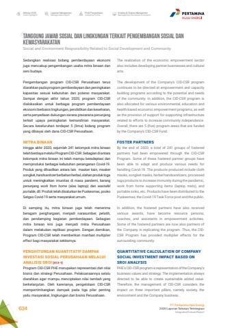TANGGUNG JAWAB SOSIAL DAN LINGKUNGAN TERKAIT PENGEMBANGAN SOSIAL DAN KEMASYARAKATANSocial and Environment Responsibility Related to Social Development and CommunityThe realization of the economic empowerment sector also includes developing partner businesses and cultural arts.The development of the Company%u2019s CID-CSR program continues to be directed at empowerment and capacity building programs according to the potential and needs of the community. In addition, the CID-CSR program is also allocated for various environmental, education and health-based economic empowerment programs, as well as the provision of support for supporting infrastructure related to efforts to increase community independence. Overall, there are 5 (five) program areas that are funded by the Company%u2019s CID-CSR Fund.FOSTER PARTNERS By the end of 2020, a total of 241 groups of fostered partners had been empowered through the CID-CSR Program. Some of these fostered partner groups have been able to adapt and produce various needs for handling Covid-19. The products produced include cloth masks, songket masks, herbal handsanitizers, processed toga products to increase immunity during the pandemic, work from home supporting items (laptop mats), and portable sinks, etc. Products have been distributed to the Puskesmas, the Covid-19 Task Force post and the public.In addition, the fostered partners have also received various awards, have become resource persons, coaches, and assistants in empowerment activities. Some of the fostered partners are now also partners of the Company in replicating the program. Thus, the CIDCSR Program has provided multiplier effects for the surrounding community.QUANTITATIVE CALCULATION OF COMPANY SOCIAL INVESTMENT IMPACT BASED ON SROI ANALYSISPHE%u2019s CID-CSR program is representation of the Company%u2019s business values and strategy. The implementation always directed to be able to create sustainable added value. Therefore, the management of CID-CSR considers the impact on three important pillars, namely society, the environment and the Company business. Sedangkan realisasi bidang pemberdayaan ekonomi juga mencakup pengembangan usaha mitra binaan dan seni budaya.Pengembangan program CID-CSR Perusahaan terus diarahkan pada program pemberdayaan dan peningkatan kapasitas sesuai kebutuhan dan potensi masyarakat. Sampai dengan akhir tahun 2020, program CID-CSR dialokasikan untuk berbagai program pemberdayaan ekonomi berbasis lingkungan, pendidikan dan kesehatan, serta penyediaan dukungan sarana prasarana penunjang terkait upaya peningkatan kemandirian masyarakat. Secara keseluruhan terdapat 5 (lima) bidang program yang dibiayai oleh dana CID-CSR Perusahaan.MITRA BINAANHingga akhir 2020, sejumlah 241 kelompok mitra binaan telah berdaya melalui Program CID-CSR. Sebagian di antara kelompok mitra binaan ini telah mampu beradaptasi dan memproduksi berbagai kebutuhan penanganan Covid-19. Produk yang dihasilkan antara lain masker kain, masker songket, handsanitizer berbahan herbal, olahan produk toga untuk meningkatkan imunitas di masa pandemi, barang penunjang work from home (alas laptop) dan wastafel portable, dll. Produk telah disalurkan ke Puskesmas, posko Satgas Covid-19 serta masyarakat umum.Di samping itu, mitra binaan juga telah menerima beragam penghargaan, menjadi narasumber, pelatih, dan pendamping kegiatan pemberdayaan. Sebagian mitra binaan kini juga menjadi mitra Perusahaan dalam melakukan replikasi program. Dengan demikian, Program CID-CSR telah memberikan manfaat multiplier effect bagi masyarakat sekitarnya.PENGHITUNGAN KUANTITATIF DAMPAK INVESTASI SOSIAL PERUSAHAAN MELALUI ANALISIS SROI [413-1]Program CID-CSR PHE merupakan representasi dari nilai bisnis dan strategi Perusahaan. Pelaksanaannya selalu diarahkan agar mampu menciptakan nilai tambah yang berkelanjutan. Oleh karenanya, pengelolaan CID-CSR mempertimbangkan dampak pada tiga pilar penting yaitu masyarakat, lingkungan dan bisnis Perusahaan.Laporan ManajemenManagement ReportProfil PerusahaanCompany ProfileAnalisa & Diskusi ManajemenManagement Discussion & AnalysisIkhtisar 20202020 HighlightsPT Pertamina Hulu Energi2020 Laporan Tahunan TerintegrasiIntegrated Annual Report 634