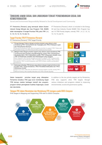 TANGGUNG JAWAB SOSIAL DAN LINGKUNGAN TERKAIT PENGEMBANGAN SOSIAL DAN KEMASYARAKATANSocial and Environment Responsibility Related to Social Development and CommunityPT Pertamina (Persero) which is included in the Energy Oil and Gas Industry Cluster BUMN TJSL Program has set 10 TPB Priority targets, namely TPB 1, 4, 5, 7, 8, 12, 13, 14, 15, and 16.In addition to the ten priority targets set by Pertamina, PHE also supports other TPB targets through various initiatives and programs related to improving environmental, social and governance quality.PT Pertamina (Persero) yang termasuk dalam kluster industri Energi Minyak dan Gas Program TJSL BUMN telah menetapkan 10 target Prioritas TPB, yaitu TPB 1, 4, 5, 7, 8, 12, 13, 14, 15, dan 16. A Pengembangan Potensi dengan prioritas program yang relevan untuk mendukung TPB 7 Energi Bersih dan Terjangkau dan TPB 8 Pekerjaan Layak dan Pertumbuhan Ekonomi.Potential Development with relevant program priorities to support TPB 7 Clean and Affordable Energy and TPB 8 Decent Work and Economic Growth.B Mitigasi risiko dengan prioritas rogram yang relevan untuk mendukung TPB 12 Konsumsi dan Produksi yang Bertanggung Jawab, TPB 13 Penanganan Perubahan Iklim, TPB 14 Ekosistem Lautan, TPB 15 Ekosistem Daratan, serta TPB 16 Perdamaian, Keadilan dan Kelembagaan yang Tangguh. Risk mitigation with relevant program priorities to support TPB 12 Responsible Consumption and Production, TPB 13 Handling Climate Change, TPB 14 Ocean Ecosystem, TPB 15 Land Ecosystem, and TPB 16 Peace, Justice and Resilient Institutions.C Dukungan terhadap TPB lainnya yang relevan dengan target prioritas A dan B, yakni TPB 1 Tanpa Kemiskinan, TPB 4 Pendidikan Berkualitas dan TPB 5 Kesetaraan Gender.Support for other TPBs that are relevant to priority targets A and B, namely TPB 1 Without Poverty, TPB 4 Quality Education and TPB 5 Gender Equality.Target Prioritas TPB PT Pertamina (Persero) PT Pertamina (Persero)%u2019 TPB Target PrioritySelain kesepuluh prioritas target yang ditetapkan Pertamina tersebut, PHE juga turut mendukung target TPB lainnya melalui berbagai inisiatif dan programprogram terkait peningkatan kualitas lingkungan, sosial dan tata kelola.Tahapan PHE dalam Memetakan dan Mendukung TPB mengacu pada SDGS CompassPHE Stages in Mapping and Supporting TPB refer to SDGS CompassPemahaman TPBAwarnes about TPBPemetaan Prioritasterhadap TPBPriority Mappingto PTBMenentukan Kinerja Utama yang Mendukung TPBDetermining the Main Performance that Supports TPBIntegrasi Melalui Kerjasama dan KolaborasiIntegration Through Cooperation and ColaborationPelaporan dan SosialisasiReporting and Socialization0102030405Laporan ManajemenManagement ReportProfil PerusahaanCompany ProfileAnalisa & Diskusi ManajemenManagement Discussion & AnalysisIkhtisar 20202020 HighlightsPT Pertamina Hulu Energi2020 Laporan Tahunan TerintegrasiIntegrated Annual Report 638