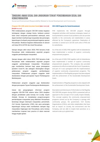 TANGGUNG JAWAB SOSIAL DAN LINGKUNGAN TERKAIT PENGEMBANGAN SOSIAL DAN KEMASYARAKATANSocial and Environment Responsibility Related to Social Development and CommunityCID-CSR Program for Social Investment PHE implements the CID-CSR program through integrated activities with business strategies, based on local potential to answer local problems and can provide benefits to the community and stakeholders in areas affected by the Company%u2019s operations. Realization of activities is carried out in all CID work units in PHE and its subsidiaries.As of the end of 2020, PHE together with its Subsidiaries have implemented a number of superior community empowerment programs. As of the end of 2020, PHE together with its Subsidiaries have implemented a number of superior community empowerment programs. The company also provided assistance for efforts to deal with the Covid-19 pandemic, and part of it was synergized with the implementation of superior community empowerment programs. The implementation of the flagship program has been aligned with the achievement of the Sustainable Development Goals.Implementation of flagship programs is also aligned with the achievement of the Sustainable Development Goals.Description and disclosure of information on the flagship CID-CSR PHE program during 2020 is presented with an approach to the concept of Act Locally, Inspire Globally. This concept explains the community empowerment programs carried out by the Company in synergy with community groups, the government, Civil Society Organizations (CSOs), and other stakeholders that have had an impact on society, the environment and the Company, and are able to inspire best practices on a national scale up to global level.Program CID-CSR untuk Investasi Sosial [SOC-13.C1,C2] [POJK51-6.c.3.c]PHE melaksanakan program CID-CSR melalui kegiatan terintegrasi dengan strategi bisnis, berbasis potensi lokal untuk menjawab permasalahan setempat, serta dapat memberi manfaat bagi masyarakat dan pemangku kepentingan di wilayah yang terdampak kegiatan operasi Perusahaan. Realisasi kegiatan dilaksanakan di seluruh unit kerja CID di di PHE dan Anak Perusahaan.Sampai dengan akhir tahun 2020, PHE bersama Anak Perusahaan telah melaksanakan sejumlah program unggulan pemberdayaan masyarakat. Sampai dengan akhir tahun 2020, PHE bersama Anak Perusahaan telah melaksanakan sejumlah program unggulan pemberdayaan masyarakat. Perusahaan juga memberikan bantuan bagi upaya penanganan pandemi Covid-19, dan sebagian disinergikan dengan pelaksanaan program unggulan pemberdayaan masyarakat. Pelaksanaan program unggulan telah diselaraskan dengan pencapaian Tujuan Pembangunan Berkelanjutan.Pelaksanaan program unggulan juga diselaraskan dengan pencapaian Tujuan Pembangunan Berkelanjutan.Uraian dan pengungkapan informasi program unggulan CID-CSR PHE selama tahun 2020 disajikan dengan pendekatan pada konsep Act Locally, Inspire Globally. Konsep ini menjelaskan program-program pemberdayaan masyarakat yang dilakukan Perusahaan bersinergi dengan kelompok masyarakat, pemerintah, Civil Society Organisation (CSO), dan para pemangku kepentingan lainnya telah memberikan dampak bagi masyarakat, lingkungan dan Perusahaan, serta mampu memberikan inspirasi best practice di skala nasional hingga tingkat global.Tata Kelola Perusahaan yang BaikGood Corporate GovernanceTanggung Jawab Sosial PerusahaanCorporate Social ResponsibilityLaporan Keuangan KonsolidasianConsolidated Financial ReportPT Pertamina Hulu Energi2020 Laporan Tahunan TerintegrasiIntegrated Annual Report 639