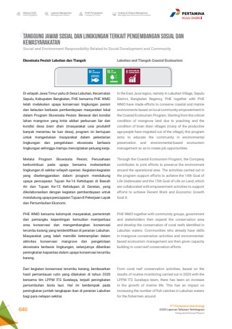 TANGGUNG JAWAB SOSIAL DAN LINGKUNGAN TERKAIT PENGEMBANGAN SOSIAL DAN KEMASYARAKATANSocial and Environment Responsibility Related to Social Development and CommunityLabuhan and Tlangoh Coastal EcotourismIn the East Java region, namely in Labuhan Village, Sepulu District, Bangkalan Regency, PHE together with PHE WMO have made efforts to conserve coastal and marine environments based on local community empowerment in the Coastal Ecotourism Program. Starting from the critical condition of mangrove land due to poaching and the condition of brain drain villages (many of the productive age people have migrated out of the village), this program aims to educate the community in environmental preservation and environmental-based ecotourism management so as to create job opportunities.Through the Coastal Ecotourism Program, the Company contributes to joint efforts to preserve the environment around the operational area. The activities carried out in the program support efforts to achieve the 14th Goal of Life Underwater and the 15th Goal of Life on Land, which are collaborated with empowerment activities to support efforts to achieve Decent Work and Economic Growth Goal 8.PHE WMO together with community groups, government and stakeholders then expand the conservation area and develop the conservation of coral reefs identified in Labuhan waters. Communities who already have skills in mangrove conservation activities and environmentalbased ecotourism management are then given capacity building in coral reef conservation efforts.From coral reef conservation activities, based on the results of routine monitoring carried out in 2020 with the LPPM ITS Surabaya team, there has been an increase in the growth of marine life. This has an impact on increasing the number of fish catches in Labuhan waters for the fishermen around.Ekowisata Pesisir Labuhan dan TlangohDi wilayah Jawa Timur yaitu di Desa Labuhan, Kecamatan Sepulu, Kabupaten Bangkalan, PHE bersama PHE WMO telah melakukan upaya konservasi lingkungan pesisir dan kelautan berbasis pemberdayaan masyarakat lokal dalam Program Ekowisata Pesisir. Berawal dari kondisi lahan mangrove yang kritis akibat perburuan liar dan kondisi desa brain drain (masyarakat usia produktif banyak merantau ke luar desa), program ini bertujuan untuk mengedukasi masyarakat dalam pelestarian lingkungan dan pengelolaan ekowisata berbasis lingkungan sehingga mampu menciptakan peluang kerja. Melalui Program Ekowisata Pesisir, Perusahaan berkontribusi pada upaya bersama melestarikan lingkungan di sekitar wilayah operasi. Kegiatan-kegiatan yang diselenggarakan dalam program mendukung upaya pencapaian Tujuan Ke-14 Kehidupan di Bawah Air dan Tujuan Ke-15 Kehidupan di Daratan, yang dikolaborasikan dengan kegiatan pemberdayaan untuk mendukung upaya pencapaian Tujuan-8 Pekerjaan Layak dan Pertumbuhan Ekonomi.PHE WMO bersama kelompok masyarakat, pemerintah dan pemangku kepentingan kemudian memperluas area konservasi dan mengembangkan konservasi terumbu karang yang teridentifikasi di perairan Labuhan. Masyarakat yang telah memiliki keterampilan dalam aktivitas konservasi mangrove dan pengelolaan ekowisata berbasis lingkungan, selanjutnya diberikan peningkatan kapasitas dalam upaya konservasi terumbu karang. Dari kegiatan konservasi terumbu karang, berdasarkan hasil pemantauan rutin yang dilakukan di tahun 2020 bersama tim LPPM ITS Surabaya, terjadi peningkatan pertumbuhan biota laut. Hal ini berdampak pada peningkatan jumlah tangkapan ikan di perairan Labuhan bagi para nelayan sekitar.Laporan ManajemenManagement ReportProfil PerusahaanCompany ProfileAnalisa & Diskusi ManajemenManagement Discussion & AnalysisIkhtisar 20202020 HighlightsPT Pertamina Hulu Energi2020 Laporan Tahunan TerintegrasiIntegrated Annual Report 640