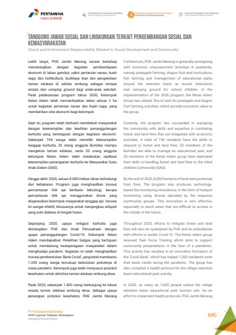 TANGGUNG JAWAB SOSIAL DAN LINGKUNGAN TERKAIT PENGEMBANGAN SOSIAL DAN KEMASYARAKATANSocial and Environment Responsibility Related to Social Development and CommunityFurthermore, PHE Jambi Merang is gradually synergizing with economic empowerment activities in peatlands, namely pineapple farming, dragon fruit and horticulture, fish farming and management of educational parks around the retention basin as tourist attractions and camping ground for school children. In the implementation of the 2020 program, the Ketan Adem Group has utilized 2ha of land for pineapple and dragon fruit farming activities, which provide economic value to the group.Currently, the program has succeeded in equipping the community with skills and expertise in combating forest and land fires that are integrated with economic activities. A total of 194 residents have the skills to respond to forest and land fires, 20 members of the Bumdes are able to manage an educational park, and 20 members of the Ketan Adem group have replicated their skills in handling forest and land fires to the tribal children Community (SAD).By the end of 2020, 8,000 hectares of land were protected from fires. The program also produces technologybased fire monitoring innovations, in the form of hotspot monitoring using drones operated by fire response community groups. This innovation is very effective, especially to reach areas that are difficult to access in the middle of the forest.Throughout 2020, efforts to mitigate forest and land fires will also be synergized by PHE and its subsidiaries with efforts to tackle Covid-19. The Ketan Adem group received Task Force Training which aims to support community preparedness in the face of a pandemic. This activity has resulted in an innovative formation of the %u2018Covid Bank%u2019, which has helped 1,200 residents meet their basic needs during the pandemic. The group has also compiled a health protocol for the village retention basin educational park activity.In 2020, as many as 1,600 people visited the village retention basin educational park tourism site. As an effort to implement health protocols, PHE Jambi Merang Lebih lanjut, PHE Jambi Merang secara bertahap mensinergikan dengan kegiatan pemberdayaan ekonomi di lahan gambut, yakni pertanian nanas, buah naga dan holtikultura, budidaya ikan dan pengelolaan taman edukasi di sekitar embung sebagai tempat wisata dan camping ground bagi anak-anak sekolah. Pada pelaksanaan program tahun 2020, Kelompok Ketan Adem telah memanfaatkan lahan seluas 2 ha untuk kegiatan pertanian nanas dan buah naga, yang memberikan nilai ekonomi bagi kelompok.Saat ini, program telah berhasil membekali masyarakat dengan keterampilan dan keahlian penanggulangan karhutla yang terintegrasi dengan kegiatan ekonomi. Sebanyak 194 warga telah memiliki keterampilan tanggap karhutla, 20 orang anggota Bumdes mampu mengelola taman edukasi, serta 20 orang anggota kelompok Ketan Adem telah melakukan replikasi keterampilan penanganan karhutla ke Masyarakat Suku Anak Dalam (SAD).Hingga akhir 2020, seluas 8.000 Hektar lahan terlindungi dari kebakaran. Program juga menghasilkan inovasi pemantauan titik api berbasis teknologi, berupa pemantauan titik api menggunakan drone yang dioperasikan kelompok masyarakat tanggap api. Inovasi ini sangat efektif, khususnya untuk menjangkau wilayah yang sulit diakses di tengah hutan.Sepanjang 2020, upaya mitigasi karhutla juga disinergikan PHE dan Anak Perusahaan dengan upaya penanggulangan Covid-19. Kelompok Ketan Adem mendapatkan Pelatihan Satgas yang bertujuan untuk mendukung kesiapsiagaan masyarakat dalam menghadapi pandemi. Kegiatan ini telah menghasilkan inovasi pembentukan %u2018Bank Covid%u2019, yang telah membantu 1.200 orang warga tercukupi kebutuhan pokoknya di masa pandemi. Kelompok juga telah menyusun protokol kesehatan untuk aktivitas taman edukasi embung desa. Pada 2020, sebanyak 1.600 orang berkunjung ke lokasi wisata taman edukasi embung desa. Sebagai upaya penerapan protokol kesehatan, PHE Jambi Merang Tata Kelola Perusahaan yang BaikGood Corporate GovernanceTanggung Jawab Sosial PerusahaanCorporate Social ResponsibilityLaporan Keuangan KonsolidasianConsolidated Financial ReportPT Pertamina Hulu Energi2020 Laporan Tahunan TerintegrasiIntegrated Annual Report 645