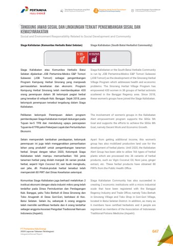 TANGGUNG JAWAB SOSIAL DAN LINGKUNGAN TERKAIT PENGEMBANGAN SOSIAL DAN KEMASYARAKATANSocial and Environment Responsibility Related to Social Development and CommunitySiaga Kalisbatan (South Batui Herbalist Community)Siaga Kalisbatan or the South Batui Herbalis Community is run by JOB Pertamina-Medco E&P Tomori Sulawesi (JOB Tomori) as the development of the Sinorang Herbal Village Program which addresses health and economic problems. The Sinorang Herbal Village Program has empowered 420 women in 38 groups of herbal activists scattered in the Banggai Regency area. Since 2018, these women%u2019s groups have joined the Siaga Kalisbatan.The involvement of women%u2019s groups in the Kalisbatan Alert empowerment program supports the SDGs 5th Goal and supports the efforts to achieve the SDGs 8th Goal, namely Decent Work and Economic Growth.Apart from getting additional income, this women%u2019s group has also mobilized productive land use for the development of herbal plants. Until 2020, the Kalisbatan Alert Group has been able to utilize 166 types of herbal plants which are processed into 36 variants of herbal products, such as Vigin Coconut Oil, Noni juice, ginger extract, etc. These herbal products have obtained 80 PIRTs from the Public Health Office.Siaga Kalisbatan Community has also succeeded in creating 2 economic institutions with a micro industrial scale that have been registered with the Banggai Regency Industry and Trade Office, namely Toko Berkah in Sinorang Village and Toko Shop in Gori-Gori Village, located in Batui Selatan District. In addition, as many as 6 members have certified herbalists and 4 people are registered as members of the Association of Indonesian Traditional Potions Medicine (Aspetri).Siaga Kalisbatan (Komunitas Herbalis Batui Selatan)Siaga Kalisbatan atau Komunitas Herbalis Batui Selatan dijalankan JOB Pertamina-Medco E&P Tomori Sulawesi (JOB Tomori) sebagai pengembangan Program Kampung Herbal Sinorang yang menjawab permasalahan kesehatan dan ekonomi. Program Kampung Herbal Sinorang telah memberdayakan 420 orang perempuan dalam 38 kelompok pegiat herbal yang tersebar di wilayah Kab. Banggai. Sejak 2018, para kelompok perempuan tersebut tergabung dalam Siaga Kalisbatan. Pelibatan kelompok Perempuan dalam program pemberdayaan Siaga Kalisbatan menjadi dukungan pada Tujuan ke-5 TPB dan mendukung upaya pencapaian Tujuan ke-8 TPB yakni Pekerjaan Layak dan Pertumbuhan Ekonomi.Selain memperoleh tambahan pendapatan, kelompok perempuan ini juga telah menggerakkan pemanfaatan lahan yang produktif untuk pengembangan tanaman herbal. Smpai dengan tahun 2020, Kelompok Siaga Kalisbatan telah mampu memanfaatkan 166 jenis tanaman herbal yang diolah menjadi 36 varian produk herbal, seperti Vigin Coconut Oil, sari buah mengkudu, sari jahe, dll. Produk-produk herbal tersebut telah memperoleh 80 PIRT dari Dinas Kesehatan setempat.Komunitas Siaga Kalisbatan juga berhasil melahirkan 2 institusi ekonomi dengan skala industri mikro yang telah terdaftar pada Dinas Perindustrian dan Perdagangan Kab. Banggai, yaitu Toko Berkah di Desa Sinorang dan Toko Anugerah di Desa Gori-Gori, berlokasi di Kec. Batui Selatan. Selain itu, sebanyak 6 orang anggota telah memiliki sertifikasi herbalis dan 4 orang terdaftar sebagai anggota Asosiasi Pengobat Tradisional Ramuan Indonesia (Aspetri).Tata Kelola Perusahaan yang BaikGood Corporate GovernanceTanggung Jawab Sosial PerusahaanCorporate Social ResponsibilityLaporan Keuangan KonsolidasianConsolidated Financial ReportPT Pertamina Hulu Energi2020 Laporan Tahunan TerintegrasiIntegrated Annual Report 647