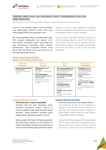 TANGGUNG JAWAB SOSIAL DAN LINGKUNGAN TERKAIT PENGEMBANGAN SOSIAL DAN KEMASYARAKATANSocial and Environment Responsibility Related to Social Development and Communityincrease in turnover is also supported by marketing innovations developed by online groups, namely through the application %u201cPASOL%u201d or online marketing.From the results of the SROI calculation carried out in 2019, the program produced a value of 1: 5.91. This value shows that for every Rp1 that the Company invests in empowerment programs, it has provided social benefits worth more than Rp5.91 in total for PHE and other stakeholders.TANGGAP BENCANA PHE PEDULI%u2022 PHE Peduli about Covid-19 for Medical WorkersThe contribution of PHE and its Subsidiaries in helping to deal with the Covid-19 pandemic in Indonesia was carried out through assistance to health workers. Health workers are at the forefront of handling the COVID-19 pandemic.Through the PHE Peduli program, PHE has distributed PPE for medical personnel to 25 Puskesmas in the Greater Jakarta area, most of which are in the red zone area, to support the role of Puskesmas in omset ini turut didukung dengan inovasi pemasaran yang dikembangkan kelompok secara online, yaitu melalui aplikasi %u2018PASOL%u2019 atau pemasaran online.Dari hasil penghitungan SROI yang dilaksanakan tahun 2019, program menghasilkan nilai sebesar 1:5.91. Nilai tersebut menunjukkan bahwa untuk setiap Rp1 yang diinvestasikan Perusahaan dalam program pemberdayaan, telah memberikan manfaat sosial bernilai lebih dari Rp5.91 secara total bagi PHE dan pemangku kepentingan lainnya.Manfaat Program Siaga KalisbatanBenefits of the Kalisbatan Alert ProgramLingkunganEnvironmentEkonomiEconomicSosialSocialKesejahteraanSocial Welfare%u2022 166 jenis tanaman herbaltermanfaatkan.166 types of herbal plants utilized.%u2022 452 juta/tahun Omset Kalisbatan.452 million / year Kalisbatan turnover.%u2022 68.7% peningkatan penjualan produk herbal di masa pandemi.68.7% increase in sales of herbal products during a pandemic.%u2022 420 orang perempuan aktif dalam pengolahan herbal.420 women are active in herbal processing.%u2022 38 kelompok perempuan mitra program terbentuk dan berdaya.38 groups of women program partners were formed and empowered.%u2022 6 orang perempuan tersertifikasi herbalis.6 women were certified herbalists.%u2022 4 orang menjadi anggota Aspetri.4 people become Aspetri members.%u2022 2 kelompok replikasi herbal Batui Selatan.2 groups of South Batui herbal replication.%u2022 Hasil SROI program 1:5,90.Results of SROI program 1: 5.90.%u2022 Hasil Studi IKM 3.5 (dari skala 4), kategori %u2018Sangat Baik%u2019.IKM Study Results 3.5 (from a scale of 4), category 'Very Good'.TANGGAP BENCANA PHE PEDULI%u2022 PHE Peduli Covid-19 untuk Tenaga Medis Kontribusi PHE dan Anak Perusahaan dalam membantu penanganan pandemi Covid-19 di Indonesia dilakukan melalui bantuan kepada tenaga kesehatan. Tenaga kesehatan merupakan garda terdepan dalam penanganan pandemi Covid-19.Melalui program PHE Peduli, PHE telah menyalurkan APD bagi tenaga kesehatan ke 25 Puskesmas di wilayah Jabodetabek, sebagian besar berada di area red zone, untuk mendukung peran Puskesmas dalam Tata Kelola Perusahaan yang BaikGood Corporate GovernanceTanggung Jawab Sosial PerusahaanCorporate Social ResponsibilityLaporan Keuangan KonsolidasianConsolidated Financial ReportPT Pertamina Hulu Energi2020 Laporan Tahunan TerintegrasiIntegrated Annual Report 649
