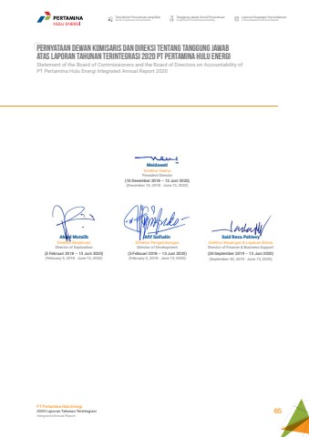 MeidawatiDirektur UtamaPresident Director(10 Desember 2018 %u2013 13 Juni 2020)(December 10, 2018 - June 13, 2020)Abdul MutalibDirektur Eksplorasi Director of Exploration(5 Februari 2018 %u2013 13 Juni 2020)(February 5, 2018 - June 13, 2020)Said Reza PahlevyDirektur Keuangan & Layanan BisnisDirector of Finance & Business Support(30 September 2019 %u2013 13 Juni 2020)(September 30, 2019 - June 13, 2020)Afif SaifudinDirektur PengembanganDirector of Development(5 Februari 2018 %u2013 13 Juni 2020)(February 5, 2018 - June 13, 2020)PERNYATAAN DEWAN KOMISARIS DAN DIREKSI TENTANG TANGGUNG JAWAB ATAS LAPORAN TAHUNAN terintegrasi 2020 PT PERTAMINA HULU ENERGIStatement of the Board of Commissioners and the Board of Directors on Accountability of PT Pertamina Hulu Energi Integrated Annual Report 2020Tata Kelola Perusahaan yang BaikGood Corporate GovernanceTanggung Jawab Sosial PerusahaanCorporate Social ResponsibilityLaporan Keuangan KonsolidasianConsolidated Financial ReportPT Pertamina Hulu Energi2020 Laporan Tahunan TerintegrasiIntegrated Annual Report 65