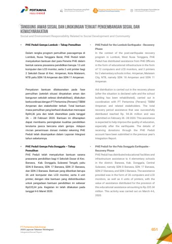 TANGGUNG JAWAB SOSIAL DAN LINGKUNGAN TERKAIT PENGEMBANGAN SOSIAL DAN KEMASYARAKATANSocial and Environment Responsibility Related to Social Development and Community%u2022 PHE Peduli for the Lombok Earthquake - Recovery PhaseIn the context of the post-earthquake recovery program in Lombok, West Nusa Tenggara, PHE Peduli has distributed assistance from PHE Officers in the form of educational infrastructure in the form of 12 computers and LCD monitors, and 2 printers for 2 elementary schools in Kec. Ampenan, Mataram City, NTB, namely SDN 18 Ampenan and SDN 11 Ampenan.Aid distribution is carried out in the recovery phase (after the situation is declared safe and the school building has been rehabilitated), carried out in coordination with PT Pertamina (Persero) TBBM Ampenan and related stakeholders. The total recovery period assistance that was successfully distributed reached Rp. 94.36 million and was submitted on February 26 - 28 2020. This assistance is expected to help improve the quality of education, especially after the earthquake. The details of receiving donations through the PHE Peduli account have been submitted in the previous year%u2019s Integration Report.%u2022 PHE Peduli for the Palu Donggala Earthquake - Recovery PhasePHE Peduli has distributed educational facilities and infrastructure assistance to 4 elementary schools in the district. Banawa, Kab. Donggala, Central Sulawesi, namely SDN 8 Banawa, SDN 17 Banawa, SDN 21 Banawa, and SDN 2 Banawa. The assistance provided was in the form of 36 computers and LCD monitors, as well as 4 units of printers, with the value of assistance distributed for the provision of this educational assistance amounting to Rp.235.34 million. This activity was carried out on March 4-6, 2020.%u2022 PHE Peduli Gempa Lombok %u2013 Tahap PemulihanDalam rangka program pemulihan pascagempa di Lombok, Nusa Tenggara Barat, PHE Peduli telah menyalurkan bantuan dari para Perwira PHE dalam bentuk sarana prasarana pendidikan berupa 12 unit komputer dan LCD monitor, serta 2 unit printer bagi 2 Sekolah Dasar di Kec. Ampenan, Kota Mataram, NTB yaitu SDN 18 Ampenan dan SDN 11 Ampenan. Penyaluran bantuan dilaksanakan pada fase pemulihan (setelah situasi dinyatakan aman dan bangunan sekolah selesai direhabilitasi), dilakukan berkoordinasi dengan PT Pertamina (Persero) TBBM Ampenan dan stakeholder terkait. Total bantuan masa pemulihan yang berhasil disalurkan mencapai Rp94,36 juta dan telah diserahkan pada tanggal 26 %u2013 28 Februari 2020. Bantuan ini diharapkan dapat membantu peningkatan kualitas pendidikan terutama pasca bencana alam gempa. Adapun rincian penerimaan donasi melalui rekening PHE Peduli telah disampaikan dalam Laporan Integrasi tahun sebelumnya.%u2022 PHE Peduli Gempa Palu Donggala %u2013 Tahap Pemulihan PHE Peduli telah menyalurkan bantuan sarana prasarana pendidikan bagi 4 Sekolah Dasar di Kec. Banawa, Kab. Donggala, Sulawesi Tengah, yaitu SDN 8 Banawa, SDN 17 Banawa, SDN 21 Banawa, dan SDN 2 Banawa. Bantuan yang diberikan berupa 36 unit komputer dan LCD monitor, serta 4 unit printer, dengan nilai bantuan yang didistribusikan untuk pengadaan bantuan pendidikan ini sebesar Rp235,34 juta. Kegiatan ini telah dilakukan pada tanggal 4-6 Maret 2020.Tata Kelola Perusahaan yang BaikGood Corporate GovernanceTanggung Jawab Sosial PerusahaanCorporate Social ResponsibilityLaporan Keuangan KonsolidasianConsolidated Financial ReportPT Pertamina Hulu Energi2020 Laporan Tahunan TerintegrasiIntegrated Annual Report 651