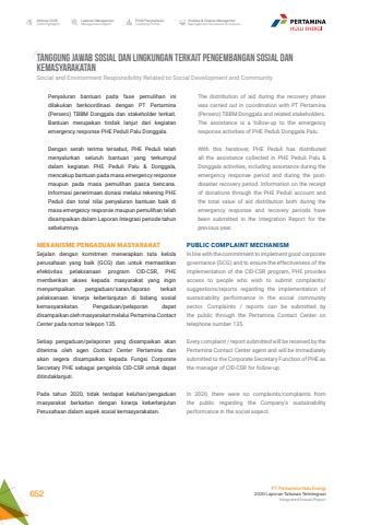 TANGGUNG JAWAB SOSIAL DAN LINGKUNGAN TERKAIT PENGEMBANGAN SOSIAL DAN KEMASYARAKATANSocial and Environment Responsibility Related to Social Development and CommunityThe distribution of aid during the recovery phase was carried out in coordination with PT Pertamina (Persero) TBBM Donggala and related stakeholders. The assistance is a follow-up to the emergency response activities of PHE Peduli Donggala Palu.With this handover, PHE Peduli has distributed all the assistance collected in PHE Peduli Palu & Donggala activities, including assistance during the emergency response period and during the postdisaster recovery period. Information on the receipt of donations through the PHE Peduli account and the total value of aid distribution both during the emergency response and recovery periods have been submitted in the Integration Report for the previous year.PUBLIC COMPLAINT MECHANISM In line with the commitment to implement good corporate governance (GCG) and to ensure the effectiveness of the implementation of the CID-CSR program, PHE provides access to people who wish to submit complaints/suggestions/reports regarding the implementation of sustainability performance in the social community sector. Complaints / reports can be submitted by the public through the Pertamina Contact Center on telephone number 135.Every complaint / report submitted will be received by the Pertamina Contact Center agent and will be immediately submitted to the Corporate Secretary Function of PHE as the manager of CID-CSR for follow-up.In 2020, there were no complaints/complaints from the public regarding the Company%u2019s sustainability performance in the social aspect.Penyaluran bantuan pada fase pemulihan ini dilakukan berkoordinasi dengan PT Pertamina (Persero) TBBM Donggala dan stakeholder terkait. Bantuan merupakan tindak lanjut dari kegiatan emergency response PHE Peduli Palu Donggala.Dengan serah terima tersebut, PHE Peduli telah menyalurkan seluruh bantuan yang terkumpul dalam kegiatan PHE Peduli Palu & Donggala, mencakup bantuan pada masa emergency responsemaupun pada masa pemulihan pasca bencana. Informasi penerimaan donasi melalui rekening PHE Peduli dan total nilai penyaluran bantuan baik di masa emergency response maupun pemulihan telah disampaikan dalam Laporan Integrasi periode tahun sebelumnya.MEKANISME PENGADUAN MASYARAKATSejalan dengan komitmen menerapkan tata kelola perusahaan yang baik (GCG) dan untuk memastikan efektivitas pelaksanaan program CID-CSR, PHE memberikan akses kepada masyarakat yang ingin menyampaikan pengaduan/saran/laporan terkait pelaksanaan kinerja keberlanjutan di bidang sosial kemasyarakatan. Pengaduan/pelaporan dapat disampaikan oleh masyarakat melalui Pertamina Contact Center pada nomor telepon 135. Setiap pengaduan/pelaporan yang disampaikan akan diterima oleh agen Contact Center Pertamina dan akan segera disampaikan kepada Fungsi Corporate Secretary PHE sebagai pengelola CID-CSR untuk dapat ditindaklanjuti. Pada tahun 2020, tidak terdapat keluhan/pengaduan masyarakat berkaitan dengan kinerja keberlanjutan Perusahaan dalam aspek sosial kemasyarakatan.Laporan ManajemenManagement ReportProfil PerusahaanCompany ProfileAnalisa & Diskusi ManajemenManagement Discussion & AnalysisIkhtisar 20202020 HighlightsPT Pertamina Hulu Energi2020 Laporan Tahunan TerintegrasiIntegrated Annual Report 652