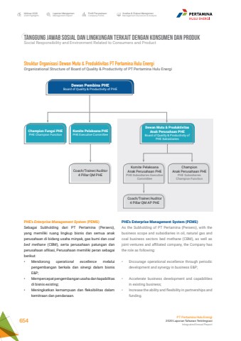 PHE%u2019s Enterprise Management System (PEMS)As the Subholding of PT Pertamina (Persero), with the business scope and subsidiaries in oil, natural gas and coal business sectors bed methane (CBM), as well as joint ventures and affiliated company, the Company has the role as following:%u2022 Encourage operational excellence through periodic development and synergy in business E&P;%u2022 Accelerate business development and capabilities in existing business;%u2022 Increase the ability and flexibility in partnerships and funding.Dewan Pembina PHEBoard of Quality & Productivity of PHEChampion Fungsi PHEPHE Champion FunctionKomite Pelaksana PHEPHE Executive CommitteeCoach/Trainer/Auditor 4 Pillar QM PHEKomite Pelaksana Anak Perusahaan PHEPHE Subsidiaries Executive CommitteeCoach/Trainer/Auditor 4 Pillar QM AP PHEChampion Anak Perusahaan PHEPHE Subsidiaries Champion FunctionDewan Mutu & Produktivitas Anak Perusahaan PHEBoard of Quality & Productivity of PHE SubsidiariesStruktur Organisasi Dewan Mutu & Produktivitas PT Pertamina Hulu EnergiOrganizational Structure of Board of Quality & Productivity of PT Pertamina Hulu EnergiPHE%u2019s Enterprise Management System (PEMS)Sebagai Subholding dari PT Pertamina (Persero), yang memiliki ruang lingkup bisnis dan semua anak perusahaan di bidang usaha minyak, gas bumi dan coal bed methane (CBM), serta perusahaan patungan dan perusahaan afiliasi, Perusahaan memiliki peran sebagai berikut:%u2022 Mendorong operational excellence melalui pengembangan berkala dan sinergi dalam bisnis E&P; %u2022 Mempercepat pengembangan usaha dan kapabilitas di bisnis existing; %u2022 Meningkatkan kemampuan dan fleksibilitas dalam kemitraan dan pendanaan. Laporan ManajemenManagement ReportProfil PerusahaanCompany ProfileAnalisa & Diskusi ManajemenManagement Discussion & AnalysisIkhtisar 20202020 HighlightsPT Pertamina Hulu Energi2020 Laporan Tahunan TerintegrasiIntegrated Annual Report 654TANGGUNG JAWAB SOSIAL DAN LINGKUNGAN TERKAIT DENGAN KONSUMEN DAN PRODUKSocial Responsibility and Environment Related to Consumers and Product