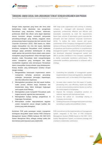With large scale organization and continue to develop, company is managed with structured, coherent, systematic, professional, effective and efficient and executable consistently by meet the requirements recent laws, articles of association, good corporate law principles and best practices Corporate Governance (GCG). To realize the vision, mission and goals, commitment of the Company%u2019s management to perform various continuous improvement efforts at each aspects of operations and business portfolios in comprehensive management system. To achieve the goals the Company has developed integrated management system and able to provide confidence in the Company capabilities to realize sustainable excellence performance. This sustainable excellence performance is achieved with a strategy:1. Controlling the suitability of management system implementation in laws and regulations, stakeholder requirements, and / or the needs of the Organization,2. Increase value creation from the aspect of quality, processing time, cost efficiency, health and safety at work, environmental protection factors as well as the moral aspects of employees,3. Improve the Company competitive position on national, regional and international levels.4. Improve the culture of knowledge sharing in Company environment,5. Creating resources of management system activities according to quality and predefined criteria.PHE commitment on the implementation of management system integrated in the form of PHE Enterprise Management System (PEMS) based on ISO 9001: 2015 Quality Management System, as business strategy and oriented to stakeholder satisfaction.Dengan skala organisasi yang besar dan terus akan berkembang maka diperlukan tata pengelolaan Perusahaan yang terstruktur, koheren, sistematis, profesional, efektif dan efisien serta dapat dijalankan secara konsisten dengan memenuhi persyaratan perundang-undangan yang berlaku, anggaran dasar, prinsip-prinsip hukum korporasi dan best practice Good Corporate Governance (GCG). Oleh karena itu, dalam rangka mewujudkan visi, misi dan tujuan, diperlukan komitmen manajemen Perusahaan untuk melakukan berbagai upaya perbaikan berkelanjutan di setiap aspek operasi dan portofolio bisnis dalam suatu sistem manajemen yang komprehensif. Untuk mencapai tujuan tersebut, maka Perusahaan telah mengembangkan sistem manajemen yang terintegrasi dan dapat memberikan keyakinan atas kemampuan Perusahaan dalam mewujudkan kinerja ekselen yang berkelanjutan. Kinerja ekselen yang berkelanjutan tersebut dicapai dengan strategi:1. Mengendalikan kesesuaian implementasi sistem manajemen terhadap peraturan perundangundangan, persyaratan pemangku kepentingan, dan/atau kebutuhan Organisasi,2. Meningkatkan penciptaan nilai dari aspek kualitas, waktu proses, efisiensi biaya, kesehatan dan keselamatan kerja, faktor lindungan lingkungan serta aspek moral Pekerja,3. Meningkatkan posisi kompetitif Perusahaan pada tingkat nasional, regional dan internasional.4. Meningkatkan budaya berbagi pengetahuan di lingkungan Perusahaan,5. Menciptakan sumber daya/pelaksana kegiatan sistem manajemen sesuai dengan kualitas dan kriteria yang telah ditetapkan.Komitmen PHE pada penerapan sistem manajemen terintegrasi diwujudkan dalam bentuk PHE%u2019s Enterprise Management System (PEMS) berbasis ISO 9001:2015 Sistem Manajemen Mutu, sebagai strategi usaha dan berorientasi pada kepuasan para stakeholder. Tata Kelola Perusahaan yang BaikGood Corporate GovernanceTanggung Jawab Sosial PerusahaanCorporate Social ResponsibilityLaporan Keuangan KonsolidasianConsolidated Financial ReportPT Pertamina Hulu Energi2020 Laporan Tahunan TerintegrasiIntegrated Annual Report 655TANGGUNG JAWAB SOSIAL DAN LINGKUNGAN TERKAIT DENGAN KONSUMEN DAN PRODUKSocial Responsibility and Environment Related to Consumers and Product