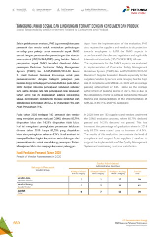 Apart from the implementation of the evaluation, PHE also requires the suppliers and vendors to do protection towards employees to fulfill the SMK3 aspects in accordance with the rules and regulations and applicable international standards (ISO/OHSAS/ SRS). All overThe requirements for the SMK3 aspects are evaluated in implementation of Contractor Safety Management Guidelines System (CSMS) No. A-005/PHE020/2016-S0 Revision 2. Supplier Evaluation Results especially for the suppliers/vendors by service work category has the high risk of compliance with SMK3LL in 2020 with an average passing achievement of 63% same as the average achievement of passing scores in 2019, this is due to the consistency efforts to increase competence through training and standardization of the implementation of SMK3LL in the PHE and PHE subsidiary.In 2020 there are 183 suppliers and vendors underwent the CSMS evaluation process, where 85.79% declared passed and 14.21% declared not passed. This has increased the percentage of graduation where in 2019 only 81.55% were stated pass or increase of 4.24%. The results of this evaluation demonstrate the level of compliance and support from suppliers / vendors to support the implementation of the Quality Management System and maintaining customer satisfaction.Selain pelaksanaan evaluasi, PHE juga mewajibkan para pemasok dan vendor untuk melakukan perlindungan terhadap para pekerja untuk memenuhi aspek SMK3 sesuai dengan peraturan dan perundangan dan standar internasional (ISO/OHSAS/ISRS) yang berlaku. Seluruh persyaratan aspek SMK3 tersebut dievaluasi dalam penerapan Pedoman Contractor Safety Management System (CSMS) No. A-005/PHE020/2016-S0 Revisi 2. Hasil Evaluasi Pemasok khususnya untuk para pemasok/vendor dengan kategori pekerjaan jasa berisiko tinggi terhadap pemenuhan SMK3LL pada tahun 2020 dengan rata-rata pencapaian kelulusan sebesar 63% sama dengan rata-rata pencapaian nilai kelulusan tahun 2019, hal ini dikarenakan adanya konsistensi upaya peningkatan kompetensi melalui pelatihan dan standarisasi penerapan SMK3LL di lingkungan PHE dan Anak Perusahaan PHE.Pada tahun 2020 terdapat 183 pemasok dan vendor yang menjalani proses evaluasi CSMS, dimana 85,79% dinyatakan lulus dan 14,21% dinyatakan tidak lulus. Hal ini mengalami peningkatan persentase kelulusan dimana tahun 2019 hanya 81,55% yang dinyatakan lulus atau peningkatan sebesar 4,24%. Hasil evaluasi ini memperlihatkan tingkat kepatuhan serta dukungan dari pemasok/vendor untuk mendukung penerapan Sistem Manajemen Mutu dan menjaga kepuasan pelanggan.Hasil Penilaian Pemasok Tahun 2020Result of Vendor Assessment in 2020Kelompok PemasokVendor GroupSanksi AdministrasiAdministrative SanctionKategori HitamBlack CategoryKategori MerahRed CategoryKategori KuningYellow CategoryJumlahTotalVendor JasaServices Vendor 0 2 27 29Vendor BarangGoods Vendor 0 5 36 41JumlahTotal 0 7 63 70TANGGUNG JAWAB SOSIAL DAN LINGKUNGAN TERKAIT DENGAN KONSUMEN DAN PRODUKSocial Responsibility and Environment Related to Consumers and ProductLaporan ManajemenManagement ReportProfil PerusahaanCompany ProfileAnalisa & Diskusi ManajemenManagement Discussion & AnalysisIkhtisar 20202020 HighlightsPT Pertamina Hulu Energi2020 Laporan Tahunan TerintegrasiIntegrated Annual Report 660
