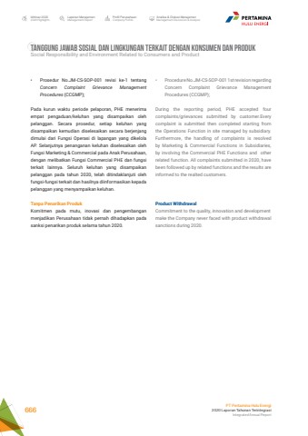 %u2022 Procedure No.JM-CS-SOP-001 1st revision regarding Concern Complaint Grievance Management Procedures (CCGMP);During the reporting period, PHE accepted four complaints/grievances submitted by customer.Every complaint is submitted then completed starting from the Operations Function in site managed by subsidiary. Furthermore, the handling of complaints is resolved by Marketing & Commercial Functions in Subsidiaries, by involving the Commercial PHE Functions and other related function. All complaints submitted in 2020, have been followed up by related functions and the results are informed to the realted customers.Product WithdrawalCommitment to the quality, innovation and developmentmake the Company never faced with product withdrawal sanctions during 2020.%u2022 Prosedur No.JM-CS-SOP-001 revisi ke-1 tentang Concern Complaint Grievance Management Procedures (CCGMP);Pada kurun waktu periode pelaporan, PHE menerima empat pengaduan/keluhan yang disampaikan oleh pelanggan. Secara prosedur, setiap keluhan yang disampaikan kemudian diselesaikan secara berjenjang dimulai dari Fungsi Operasi di lapangan yang dikelola AP. Selanjutnya penanganan keluhan diselesaikan oleh Fungsi Marketing & Commercial pada Anak Perusahaan, dengan melibatkan Fungsi Commercial PHE dan fungsi terkait lainnya. Seluruh keluhan yang disampaikan pelanggan pada tahun 2020, telah ditindaklanjuti oleh fungsi-fungsi terkait dan hasilnya diinformasikan kepada pelanggan yang menyampaikan keluhan.Tanpa Penarikan ProdukKomitmen pada mutu, inovasi dan pengembangan menjadikan Perusahaan tidak pernah dihadapkan pada sanksi penarikan produk selama tahun 2020.TANGGUNG JAWAB SOSIAL DAN LINGKUNGAN TERKAIT DENGAN KONSUMEN DAN PRODUKSocial Responsibility and Environment Related to Consumers and ProductLaporan ManajemenManagement ReportProfil PerusahaanCompany ProfileAnalisa & Diskusi ManajemenManagement Discussion & AnalysisIkhtisar 20202020 HighlightsPT Pertamina Hulu Energi2020 Laporan Tahunan TerintegrasiIntegrated Annual Report 666