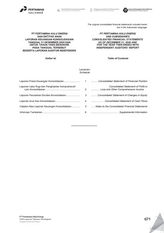The original consolidated financial statements included hereinare in the Indonesian language.PT PERTAMINA HULU ENERGIDAN ENTITAS ANAKLAPORAN KEUANGAN KONSOLIDASIANTANGGAL 31 DESEMBER 2020 DANUNTUK TAHUN YANG BERAKHIRPADA TANGGAL TERSEBUTBESERTA LAPORAN AUDITOR INDEPENDENPT PERTAMINA HULU ENERGIAND SUBSIDIARIESCONSOLIDATED FINANCIAL STATEMENTSAS OF DECEMBER 31, 2020 ANDFOR THE YEAR THEN ENDED WITHINDEPENDENT AUDITORS%u2019 REPORTDaftar Isi Table of ContentsLampiran/ScheduleLaporan Posisi Keuangan Konsolidasian........................ 1 ..........Consolidated Statement of Financial PositionLaporan Laba Rugi dan Penghasilan Komprehensif Consolidated Statement of Profit orLain Konsolidasian................................................... 2 ............. Loss and Other Comprehensive IncomeLaporan Perubahan Ekuitas Konsolidasian .................... 3 .........Consolidated Statement of Changes in EquityLaporan Arus Kas Konsolidasian .................................... 4 ................... Consolidated Statement of Cash FlowsCatatan Atas Laporan Keuangan Konsolidasian............. 5 ..... Notes to the Consolidated Financial StatementsInformasi Tambahan ....................................................... 6 ........................................ Supplemental Information***************************Tata Kelola Perusahaan yang BaikGood Corporate GovernanceTanggung Jawab Sosial PerusahaanCorporate Social ResponsibilityLaporan Keuangan KonsolidasianConsolidated Financial ReportPT Pertamina Hulu Energi2020 Laporan Tahunan TerintegrasiIntegrated Annual Report 671