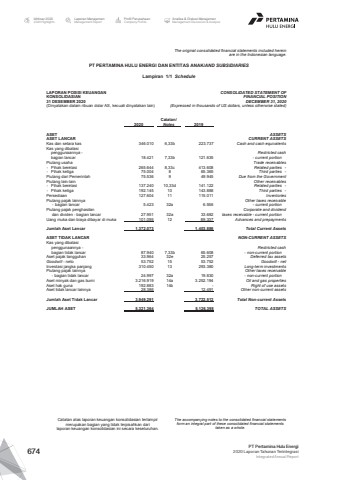 The original consolidated financial statements included hereinare in the Indonesian language.PT PERTAMINA HULU ENERGI DAN ENTITAS ANAK/AND SUBSIDIARIES Lampiran 1/1 ScheduleCatatan atas laporan keuangan konsolidasian terlampirmerupakan bagian yang tidak terpisahkan darilaporan keuangan konsolidasian ini secara keseluruhan.The accompanying notes to the consolidated financial statementsform an integral part of these consolidated financial statementstaken as a whole.LAPORAN POSISI KEUANGAN CONSOLIDATED STATEMENT OFKONSOLIDASIAN FINANCIAL POSITION31 DESEMBER 2020 DECEMBER 31, 2020(Dinyatakan dalam ribuan dolar AS, kecuali dinyatakan lain) (Expressed in thousands of US dollars, unless otherwise stated)Catatan/2020 Notes 2019ASET ASSETSASET LANCAR CURRENT ASSETSKas dan setara kas 346.010 6,33b 223.737 Cash and cash equivalentsKas yang dibatasipenggunaannya - Restricted cashbagian lancar 18.421 7,33b 121.635 - current portionPiutang usaha Trade receivables- Pihak berelasi 265.644 8,33c 413.608 Related parties -- Pihak ketiga 75.004 8 65.365 Third parties -Piutang dari Pemerintah 75.536 9 49.945 Due from the GovernmentPiutang lain-lain Other receivables- Pihak berelasi 137.240 10,33d 141.122 Related parties -- Pihak ketiga 192.145 10 143.888 Third parties -Persediaan 127.604 11 115.011 InventoriesPiutang pajak lainnya Other taxes receivable- bagian lancar 5.423 32a 6.556 - current portionPiutang pajak penghasilan Corporate and dividenddan dividen - bagian lancar 27.951 32a 33.682 taxes receivable - current portionUang muka dan biaya dibayar di muka 101.095 12 89.337 Advances and prepaymentsJumlah Aset Lancar 1.372.073 1.403.886 Total Current AssetsASET TIDAK LANCAR NON-CURRENT ASSETSKas yang dibatasipenggunaannya - Restricted cashbagian tidak lancar 87.940 7,33b 65.608 - non-current portionAset pajak tangguhan 33.964 32e 25.257 Deferred tax assetsGoodwill - neto 53.752 15 53.752 Goodwill - netInvestasi jangka panjang 310.450 13 293.380 Long-term investmentsPiutang pajak lainnya Other taxes receivable- bagian tidak lancar 24.997 32a 19.830 - non-current portionAset minyak dan gas bumi 3.216.919 14a 3.252.194 Oil and gas propertiesAset hak guna 192.883 14b - Right of use assetsAset tidak lancar lainnya 28.386 12.491 Other non-current assetsJumlah Aset Tidak Lancar 3.949.291 3.722.512 Total Non-current AssetsJUMLAH ASET 5.321.364 5.126.398 TOTAL ASSETSLaporan ManajemenManagement ReportProfil PerusahaanCompany ProfileAnalisa & Diskusi ManajemenManagement Discussion & AnalysisIkhtisar 20202020 HighlightsPT Pertamina Hulu Energi2020 Laporan Tahunan TerintegrasiIntegrated Annual Report 674