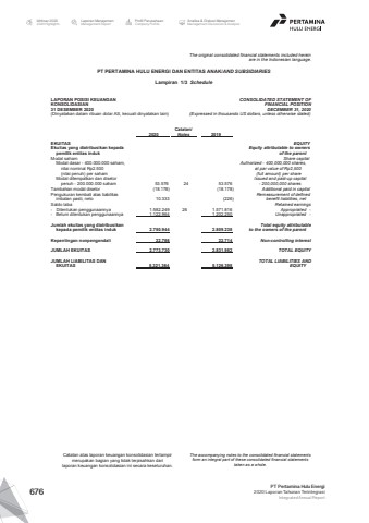 The original consolidated financial statements included hereinare in the Indonesian language.PT PERTAMINA HULU ENERGI DAN ENTITAS ANAK/AND SUBSIDIARIES Lampiran 1/3 ScheduleCatatan atas laporan keuangan konsolidasian terlampirmerupakan bagian yang tidak terpisahkan darilaporan keuangan konsolidasian ini secara keseluruhan.The accompanying notes to the consolidated financial statementsform an integral part of these consolidated financial statementstaken as a whole.LAPORAN POSISI KEUANGAN CONSOLIDATED STATEMENT OFKONSOLIDASIAN FINANCIAL POSITION31 DESEMBER 2020 DECEMBER 31, 2020(Dinyatakan dalam ribuan dolar AS, kecuali dinyatakan lain) (Expressed in thousands US dollars, unless otherwise stated)Catatan/2020 Notes 2019EKUITAS EQUITYEkuitas yang diatribusikan kepada Equity attributable to ownerspemilik entitas induk of the parentModal saham Share capitalModal dasar - 400.000.000 saham, Authorized - 400,000,000 shares,nilai nominal Rp2.500 at par value of Rp2,500(nilai penuh) per saham (full amount) per shareModal ditempatkan dan disetor Issued and paid-up capitalpenuh - 200.000.000 saham 53.576 24 53.576 - 200,000,000 sharesTambahan modal disetor (18.178) (18.178) Additional paid in capitalPengukuran kembali atas liabilitas Remeasurement of definedimbalan pasti, neto 10.333 (226) benefit liabilities, netSaldo laba Retained earnings- Ditentukan penggunaannya 1.582.249 26 1.571.816 Appropriated -- Belum ditentukan penggunaannya 1.122.964 1.202.250 Unappropriated -Jumlah ekuitas yang diatribusikan Total equity attributablekepada pemilik entitas induk 2.750.944 2.809.238 to the owners of the parentKepentingan nonpengendali 22.786 22.714 Non-controlling interestJUMLAH EKUITAS 2.773.730 2.831.952 TOTAL EQUITYJUMLAH LIABILITAS DAN TOTAL LIABILITIES ANDEKUITAS 5.321.364 5.126.398 EQUITYLaporan ManajemenManagement ReportProfil PerusahaanCompany ProfileAnalisa & Diskusi ManajemenManagement Discussion & AnalysisIkhtisar 20202020 HighlightsPT Pertamina Hulu Energi2020 Laporan Tahunan TerintegrasiIntegrated Annual Report 676