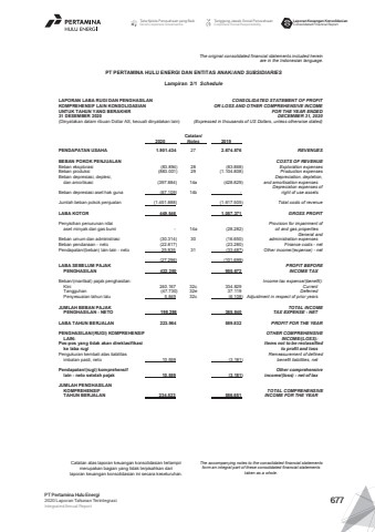 The original consolidated financial statements included hereinare in the Indonesian language.PT PERTAMINA HULU ENERGI DAN ENTITAS ANAK/AND SUBSIDIARIES Lampiran 2/1 ScheduleCatatan atas laporan keuangan konsolidasian terlampirmerupakan bagian yang tidak terpisahkan darilaporan keuangan konsolidasian ini secara keseluruhan.The accompanying notes to the consolidated financial statementsform an integral part of these consolidated financial statementstaken as a whole.LAPORAN LABA RUGI DAN PENGHASILAN CONSOLIDATED STATEMENT OF PROFITKOMPREHENSIF LAIN KONSOLIDASIAN OR LOSS AND OTHER COMPREHENSIVE INCOMEUNTUK TAHUN YANG BERAKHIR FOR THE YEAR ENDED31 DESEMBER 2020 DECEMBER 31, 2020(Dinyatakan dalam ribuan Dollar AS, kecuali dinyatakan lain) (Expressed in thousands of US Dollars, unless otherwise stated)Catatan/2020 Notes 2019PENDAPATAN USAHA 1.901.434 27 2.674.876 REVENUESBEBAN POKOK PENJUALAN COSTS OF REVENUEBeban eksplorasi (83.894) 28 (83.868) Exploration expensesBeban produksi (883.001) 29 (1.104.808) Production expensesBeban depresiasi, deplesi, Depreciation, depletion,dan amortisasi (397.884) 14a (428.829) and amortisation expensesDepreciaton expenses ofBeban depresiasi aset hak guna (87.109) 14b - right of use assetsJumlah beban pokok penjualan (1.451.888) (1.617.505) Total costs of revenueLABA KOTOR 449.546 1.057.371 GROSS PROFITPenyisihan penurunan nilai Provision for impairment ofaset minyak dan gas bumi - 14a (28.282) oil and gas propertiesGeneral andBeban umum dan administrasi (30.314) 30 (16.650) administration expensesBeban pendanaan - neto (22.817) (23.280) Finance costs - netPendapatan/(beban) lain-lain - neto 25.835 31 (33.487) Other income/(expense) - net(27.296) (101.699)LABA SEBELUM PAJAK PROFIT BEFOREPENGHASILAN 422.250 955.672 INCOME TAXBeban/(manfaat) pajak penghasilan: Income tax expense/(benefit):Kini 240.167 32c 334.829 CurrentTangguhan (47.730) 32e 37.119 DeferredPenyesuaian tahun lalu 5.849 32c (6.108) Adjustment in respect of prior yearsJUMLAH BEBAN PAJAK TOTAL INCOMEPENGHASILAN - NETO 198.286 365.840 TAX EXPENSE - NETLABA TAHUN BERJALAN 223.964 589.832 PROFIT FOR THE YEARPENGHASILAN/(RUGI) KOMPREHENSIF OTHER COMPREHENSIVELAIN: INCOME/(LOSS):Pos-pos yang tidak akan direklasifikasi Items not to be reclassifiedke laba rugi to profit and lossPengukuran kembali atas liabilitas Remeasurement of definedimbalan pasti, neto 10.559 (3.181) benefit liabilities, netPendapatan/(rugi) komprehensif Other comprehensivelain - neto setelah pajak 10.559 (3.181) income/(loss) - net of taxJUMLAH PENGHASILANKOMPREHENSIF TOTAL COMPREHENSIVETAHUN BERJALAN 234.523 586.651 INCOME FOR THE YEARTata Kelola Perusahaan yang BaikGood Corporate GovernanceTanggung Jawab Sosial PerusahaanCorporate Social ResponsibilityLaporan Keuangan KonsolidasianConsolidated Financial ReportPT Pertamina Hulu Energi2020 Laporan Tahunan TerintegrasiIntegrated Annual Report 677