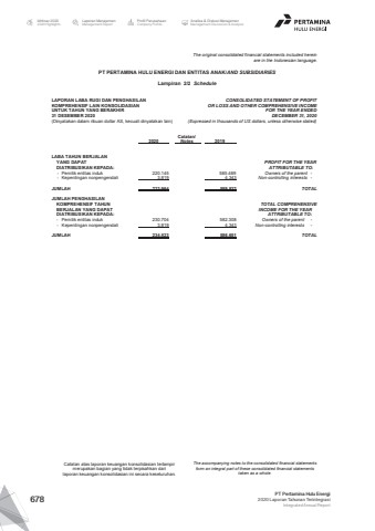 The original consolidated financial statements included hereinare in the Indonesian language.PT PERTAMINA HULU ENERGI DAN ENTITAS ANAK/AND SUBSIDIARIES Lampiran 2/2 ScheduleCatatan atas laporan keuangan konsolidasian terlampirmerupakan bagian yang tidak terpisahkan darilaporan keuangan konsolidasian ini secara keseluruhan.The accompanying notes to the consolidated financial statementsform an integral part of these consolidated financial statementstaken as a whole.LAPORAN LABA RUGI DAN PENGHASILAN CONSOLIDATED STATEMENT OF PROFITKOMPREHENSIF LAIN KONSOLIDASIAN OR LOSS AND OTHER COMPREHENSIVE INCOMEUNTUK TAHUN YANG BERAKHIR FOR THE YEAR ENDED31 DESEMBER 2020 DECEMBER 31, 2020(Dinyatakan dalam ribuan dollar AS, kecuali dinyatakan lain) (Expressed in thousands of US dollars, unless otherwise stated)Catatan/2020 Notes 2019LABA TAHUN BERJALANYANG DAPAT PROFIT FOR THE YEARDIATRIBUSIKAN KEPADA: ATTRIBUTABLE TO:- Pemilik entitas induk 220.145 585.489 Owners of the parent -- Kepentingan nonpengendali 3.819 4.343 Non-controlling interests -JUMLAH 223.964 589.832 TOTALJUMLAH PENGHASILANKOMPREHENSIF TAHUN TOTAL COMPREHENSIVEBERJALAN YANG DAPAT INCOME FOR THE YEARDIATRIBUSIKAN KEPADA: ATTRIBUTABLE TO:- Pemilik entitas induk 230.704 582.308 Owners of the parent -- Kepentingan nonpengendali 3.819 4.343 Non-controlling interests -JUMLAH 234.523 586.651 TOTALLaporan ManajemenManagement ReportProfil PerusahaanCompany ProfileAnalisa & Diskusi ManajemenManagement Discussion & AnalysisIkhtisar 20202020 HighlightsPT Pertamina Hulu Energi2020 Laporan Tahunan TerintegrasiIntegrated Annual Report 678