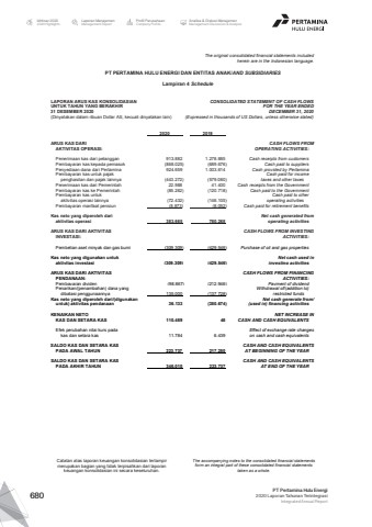 The original consolidated financial statements includedherein are in the Indonesian language.PT PERTAMINA HULU ENERGI DAN ENTITAS ANAK/AND SUBSIDIARIES Lampiran 4 ScheduleCatatan atas laporan keuangan konsolidasian terlampirmerupakan bagian yang tidak terpisahkan dari laporankeuangan konsolidasian ini secara keseluruhan.The accompanying notes to the consolidated financial statementsform an integral part of these consolidated financial statementstaken as a whole.LAPORAN ARUS KAS KONSOLIDASIAN CONSOLIDATED STATEMENT OF CASH FLOWSUNTUK TAHUN YANG BERAKHIR FOR THE YEAR ENDED31 DESEMBER 2020 DECEMBER 31, 2020(Dinyatakan dalam ribuan Dollar AS, kecuali dinyatakan lain) (Expressed in thousands of US Dollars, unless otherwise stated)2020 2019ARUS KAS DARI CASH FLOWS FROMAKTIVITAS OPERASI: OPERATING ACTIVITIES:Penerimaan kas dari pelanggan 913.882 1.278.885 Cash receipts from customersPembayaran kas kepada pemasok (868.025) (689.676) Cash paid to suppliersPenyediaan dana dari Pertamina 924.659 1.003.614 Cash provided by PertaminaPembayaran kas untuk pajak Cash paid for incomepenghasilan dan pajak lainnya (443.272) (579.080) taxes and other taxesPenerimaan kas dari Pemerintah 22.988 41.400 Cash receipts from the GovernmentPembayaran kas ke Pemerintah (85.262) (120.718) Cash paid to the GovernmentPembayaran kas untuk Cash paid to otheraktivitas operasi lainnya (72.432) (146.105) operating activitiesPembayaran manfaat pensiun (8.873) (8.052) Cash paid for retirement benefitsKas neto yang diperoleh dari Net cash generated fromaktivitas operasi 383.665 780.268 operating activitiesARUS KAS DARI AKTIVITAS CASH FLOWS FROM INVESTINGINVESTASI: ACTIVITIES:Pembelian aset minyak dan gas bumi (309.309) (429.546) Purchase of oil and gas propertiesKas neto yang digunakan untuk Net cash used inaktivitas investasi (309.309) (429.546) investing activitiesARUS KAS DARI AKTIVITAS CASH FLOWS FROM FINANCINGPENDANAAN: ACTIVITIES:Pembayaran dividen (98.867) (212.946) Payment of dividendPenarikan/(penambahan) dana yang Withdrawal of/(addition to)dibatasi penggunaannya 135.000 (137.728) restricted fundsKas neto yang diperoleh dari/(digunakan Net cash generate from/untuk) aktivitas pendanaan 36.133 (350.674) (used in) financing activitiesKENAIKAN NETO NET INCREASE INKAS DAN SETARA KAS 110.489 48 CASH AND CASH EQUIVALENTSEfek perubahan nilai kurs pada Effect of exchange rate changeskas dan setara kas 11.784 6.439 on cash and cash equivalentsSALDO KAS DAN SETARA KAS CASH AND CASH EQUIVALENTSPADA AWAL TAHUN 223.737 217.250 AT BEGINNING OF THE YEARSALDO KAS DAN SETARA KAS CASH AND CASH EQUIVALENTSPADA AKHIR TAHUN 346.010 223.737 AT END OF THE YEARLaporan ManajemenManagement ReportProfil PerusahaanCompany ProfileAnalisa & Diskusi ManajemenManagement Discussion & AnalysisIkhtisar 20202020 HighlightsPT Pertamina Hulu Energi2020 Laporan Tahunan TerintegrasiIntegrated Annual Report 680
