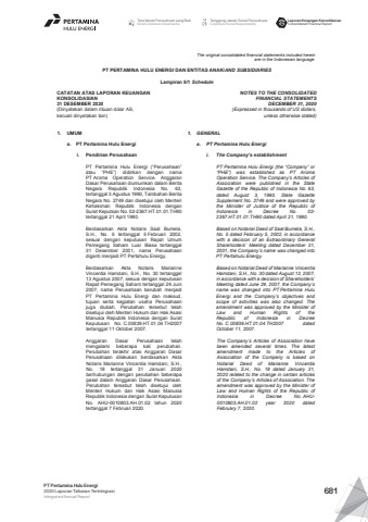 The original consolidated financial statements included hereinare in the Indonesian language.PT PERTAMINA HULU ENERGI DAN ENTITAS ANAK/AND SUBSIDIARIES Lampiran 5/1 ScheduleCATATAN ATAS LAPORAN KEUANGANKONSOLIDASIAN31 DESEMBER 2020(Dinyatakan dalam ribuan dolar AS, kecuali dinyatakan lain)NOTES TO THE CONSOLIDATEDFINANCIAL STATEMENTSDECEMBER 31, 2020(Expressed in thousands of US dollars,unless otherwise stated)1. UMUM 1. GENERALa. PT Pertamina Hulu Energi a. PT Pertamina Hulu Energii. Pendirian Perusahaan i. The Company%u2019s establishmentPT Pertamina Hulu Energi (%u201cPerusahaan%u201datau %u201cPHE%u201d) didirikan dengan namaPT Aroma Operation Service. AnggaranDasar Perusahaan diumumkan dalam BeritaNegara Republik Indonesia No. 63,tertanggal 3 Agustus 1990, Tambahan BeritaNegara No. 2749 dan disetujui oleh MenteriKehakiman Republik Indonesia denganSurat Keputsan No. 02-2367.HT.01.01.TH90tertanggal 21 April 1990.PT Pertamina Hulu Energi (the %u201cCompany%u201d or%u201cPHE%u201d) was established as PT AromaOperation Service. The Company%u2019s Articles ofAssociation were published in the StateGazette of the Republic of Indonesia No. 63,dated August 3, 1990, State GazetteSupplement No. 2749 and were approved bythe Minister of Justice of the Republic ofIndonesia in Decree No. 02-2367.HT.01.01.TH90 dated April 21, 1990.Berdasarkan Akta Notaris Saal Bumela,S.H., No. 5 tertanggal 5 Februari 2002,sesuai dengan keputusan Rapat UmumPemegang Saham Luar Biasa tertanggal31 Desember 2001, nama Perusahaandiganti menjadi PT Pertahulu Energy.Based on Notarial Deed of Saal Bumela, S.H.,No. 5 dated February 5, 2002, in accordancewith a decision of an Extraordinary GeneralShareholders%u2019 Meeting dated December 31,2001, the Company%u2019s name was changed intoPT Pertahulu Energy.Berdasarkan Akta Notaris MarianneVincentia Hamdani, S.H., No. 30 tertanggal13 Agustus 2007, sesuai dengan keputusanRapat Pemegang Saham tertanggal 29 Juni2007, nama Perusahaan berubah menjadiPT Pertamina Hulu Energi dan maksud,tujuan serta kegiatan usaha Perusahaanjuga diubah. Perubahan tersebut telahdisetujui oleh Menteri Hukum dan Hak AsasiManusia Republik Indonesia dengan SuratKeputusan No. C.00839.HT.01.04.TH2007tertanggal 11 Oktober 2007.Based on Notarial Deed of Marianne VincentiaHamdani, S.H., No. 30 dated August 13, 2007,in accordance with a decision of Shareholders%u2019Meeting dated June 29, 2007, the Company%u2019sname was changed into PT Pertamina HuluEnergi and the Company%u2019s objectives andscope of activities was also changed. Theamendment was approved by the Minister ofLaw and Human Rights of theRepublic of Indonesia in DecreeNo. C.00839.HT.01.04.TH2007 datedOctober 11, 2007.Anggaran Dasar Perusahaan telahmengalami beberapa kali perubahan.Perubahan terakhir atas Anggaran DasarPerusahaan dilakukan berdasarkan AktaNotaris Marianne Vincentia Hamdani, S.H.,No. 18 tertanggal 31 Januari 2020berhubungan dengan perubahan beberapapasal dalam Anggaran Dasar Perusahaan.Perubahan tersebut telah disetujui olehMenteri Hukum dan Hak Asasi ManusiaRepublik Indonesia dengan Surat KeputusanNo. AHU-0010803.AH.01.02 tahun 2020tertanggal 7 Februari 2020.The Company%u2019s Articles of Association havebeen amended several times. The latestamendment made to the Articles ofAssociation of the Company is based onNotarial Deed of Marianne VincentiaHamdani, S.H., No. 18 dated January 31,2020 related to the change in certain articlesof the Company%u2019s Articles of Association. Theamendment was approved by the Minister ofLaw and Human Rights of the Republic ofIndonesia in Decree No. AHU0010803.AH.01.02 year 2020 datedFebruary 7, 2020.Tata Kelola Perusahaan yang BaikGood Corporate GovernanceTanggung Jawab Sosial PerusahaanCorporate Social ResponsibilityLaporan Keuangan KonsolidasianConsolidated Financial ReportPT Pertamina Hulu Energi2020 Laporan Tahunan TerintegrasiIntegrated Annual Report 681