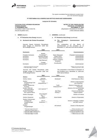 The original consolidated financial statements included hereinare in the Indonesian language.PT PERTAMINA HULU ENERGI DAN ENTITAS ANAK/AND SUBSIDIARIES Lampiran 5/3 ScheduleCATATAN ATAS LAPORAN KEUANGANKONSOLIDASIAN31 DESEMBER 2020(Dinyatakan dalam ribuan dolar AS, kecuali dinyatakan lain)NOTES TO THE CONSOLIDATEDFINANCIAL STATEMENTSDECEMBER 31, 2020(Expressed in thousands of US dollars,unless otherwise stated)1. UMUM (lanjutan) 1. GENERAL (continued)a. PT Pertamina Hulu Energi (lanjutan) a. PT Pertamina Hulu Energi (continued)iii. Komisaris dan Direksi Perusahaan iii. The Company%u2019s Commissioners andDirectorsSusunan Dewan Komisaris Perusahaanpada tanggal 31 Desember 2020 dan2019 sebagai berikut:The composition of the Board ofCommissioners of the Company as atDecember 31, 2020 and 2019 was as follows:2020 2019Komisaris: Commissioners:Presiden KomisarisRinaldiFirmansyah** Nicke Widyawati President CommissionerKomisaris Nanang Untung* Faisal Yusra CommissionerKomisaris Djoko Siswanto Djoko Siswanto CommissionerKomisaris Fadli Rahman* Prahoro YulijantoNurtjahyoCommissionerKomisarisTumpakSimanjuntak** Suwahyanto Commissioner* Efektif sejak tanggal 28 Januari 2020 * Effective since January 28, 2020** Efektif sejak tanggal 13 Juni 2020 ** Effective since June 13, 2020Susunan dari Direksi Perusahaan padatanggal tanggal 31 Desember 2020 dan2019 sebagai berikut:The composition of the Board of Directors ofthe Company as at December 31, 2020 and2019 was as follows:2020 2019Direksi: Directors:Direktur Utama BudimanParhusip**** Meidawati* Chief Executive OfficerDirekturPengembangan danProduksiTaufikAditiyawarman**** - Director of Developmentand ProductionDirektur Operasi danProduksi - TaufikAditiyawarman**Director of Operation andProductionDirektur SDM danPenunjang Bisnis Lelin Aprianto**** - Director of HC and CorporateServicesDirektur Keuangandan Layanan Bisnis - Said RezaPahlevy***Finance and BusinessSupport DirectorDirektur Keuangan Harry MozartaZen***** - Director of FinanceDirektur Eksplorasi MedyKurniawan**** Abdul Mutalib Director of ExplorationDirektur PerencanaanStrategis danPengembanganBisnisJohn HSimamora.**** - Director of Strategic, Portfolioand New VentureDirekturPengembangan - Afif Saifudin Director of Development* Efektif sejak tanggal 5 Maret 2019,sebelumnya PJ Direktur Utama* Effective since March 5, 2019,formerly Acting President Director** Efektif sejak tanggal 23 Agustus 2019 ** Effective since August 23, 2019*** Efektif sejak tanggal 30 September 2019 *** Effective since September 30, 2019**** Efektif sejak tanggal 13 Juni 2020 **** Effective since June 13, 2020***** Efektif sejak tanggal 16 Juli 2020 ***** Effective since July 16, 2020Tata Kelola Perusahaan yang BaikGood Corporate GovernanceTanggung Jawab Sosial PerusahaanCorporate Social ResponsibilityLaporan Keuangan KonsolidasianConsolidated Financial ReportPT Pertamina Hulu Energi2020 Laporan Tahunan TerintegrasiIntegrated Annual Report 683