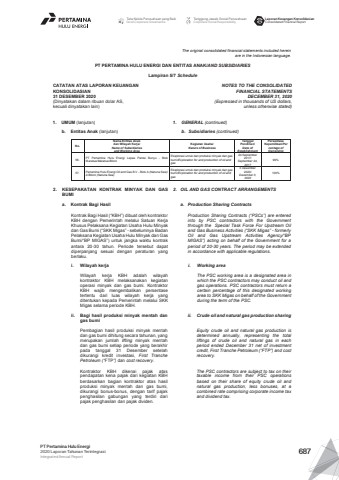 The original consolidated financial statements included hereinare in the Indonesian language.PT PERTAMINA HULU ENERGI DAN ENTITAS ANAK/AND SUBSIDIARIES Lampiran 5/7 ScheduleCATATAN ATAS LAPORAN KEUANGANKONSOLIDASIAN31 DESEMBER 2020(Dinyatakan dalam ribuan dolar AS, kecuali dinyatakan lain)NOTES TO THE CONSOLIDATEDFINANCIAL STATEMENTSDECEMBER 31, 2020(Expressed in thousands of US dollars,unless otherwise stated)1. UMUM (lanjutan) 1. GENERAL (continued)b. Entitas Anak (lanjutan) b. Subsidiaries (continued)No.Nama Entitas Anakdan Wilayah Kerja/Name of Subsidiariesand Working AreaKegiatan Usaha/Nature of BusinessTanggalPendirian/Date ofEstablishmentPersentaseKepemilikan/Percentage ofOwnership56. PT Pertamina Hulu Energi Lepas Pantai Bunyu - BlokMaratua/Maratua BlockEksplorasi untuk dan produksi minyak dan gasbumi/Exploration for and production of oil andgas24 September2017/September 24,201799%57. Pertamina Hulu Energi Oil and Gas B.V - Blok A (Natuna Sea)/A Block (Natuna Sea)Eksplorasi untuk dan produksi minyak dan gasbumi/Exploration for and production of oil andgas3 Desember2020/December 3,2020100%2. KESEPAKATAN KONTRAK MINYAK DAN GASBUMI2. OIL AND GAS CONTRACT ARRANGEMENTSa. Kontrak Bagi Hasil a. Production Sharing ContractsKontrak Bagi Hasil (%u201cKBH%u201d) dibuat oleh kontraktorKBH dengan Pemerintah melalui Satuan KerjaKhusus Pelaksana Kegiatan Usaha Hulu Minyakdan Gas Bumi (%u201cSKK Migas%u201d - sebelumnya BadanPelaksana Kegiatan Usaha Hulu Minyak dan GasBumi/%u201cBP MIGAS%u201d) untuk jangka waktu kontrakantara 20-30 tahun. Periode tersebut dapatdiperpanjang sesuai dengan peraturan yangberlaku.Production Sharing Contracts (%u201cPSCs%u201d) are enteredinto by PSC contractors with the Governmentthrough the Special Task Force For Upstream Oiland Gas Business Activities (%u201cSKK Migas%u201d - formerlyOil and Gas Upstream Activities Agency/%u201cBPMIGAS%u201d) acting on behalf of the Government for aperiod of 20-30 years. The period may be extendedin accordance with applicable regulations.i. Wilayah kerja i. Working areaWilayah kerja KBH adalah wilayahkontraktor KBH melaksanakan kegiatanoperasi minyak dan gas bumi. KontraktorKBH wajib mengembalikan persentasetertentu dari luas wilayah kerja yangditentukan kepada Pemerintah melalui SKKMigas selama periode KBH.The PSC working area is a designated area inwhich the PSC contractors may conduct oil andgas operations. PSC contractors must return acertain percentage of this designated workingarea to SKK Migas on behalf of the Governmentduring the term of the PSC.ii. Bagi hasil produksi minyak mentah dangas bumiii. Crude oil and natural gas production sharingPembagian hasil produksi minyak mentahdan gas bumi dihitung secara tahunan, yangmerupakan jumlah lifting minyak mentahdan gas bumi setiap periode yang berakhirpada tanggal 31 Desember setelahdikurangi kredit investasi, First TranchePetroleum (%u201cFTP%u201d) dan cost recovery.Equity crude oil and natural gas production isdetermined annually, representing the totalliftings of crude oil and natural gas in eachperiod ended December 31 net of investmentcredit, First Tranche Petroleum (%u201cFTP%u201d) and costrecovery.Kontraktor KBH dikenai pajak ataspendapatan kena pajak dari kegiatan KBHberdasarkan bagian kontraktor atas hasilproduksi minyak mentah dan gas bumi,dikurangi bonus-bonus, dengan tarif pajakpenghasilan gabungan yang terdiri daripajak penghasilan dan pajak dividen.The PSC contractors are subject to tax on theirtaxable income from their PSC operationsbased on their share of equity crude oil andnatural gas production, less bonuses, at acombined rate comprising corporate income taxand dividend tax.Tata Kelola Perusahaan yang BaikGood Corporate GovernanceTanggung Jawab Sosial PerusahaanCorporate Social ResponsibilityLaporan Keuangan KonsolidasianConsolidated Financial ReportPT Pertamina Hulu Energi2020 Laporan Tahunan TerintegrasiIntegrated Annual Report 687