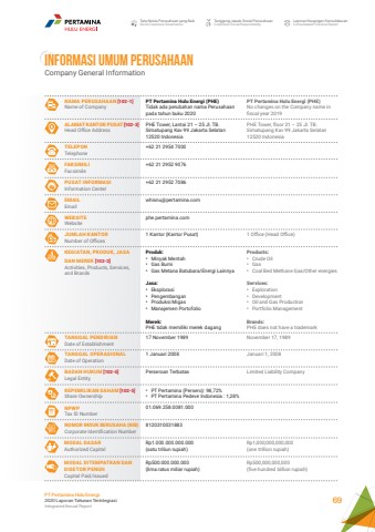 Tata Kelola Perusahaan yang BaikGood Corporate GovernanceTanggung Jawab Sosial PerusahaanCorporate Social ResponsibilityLaporan Keuangan KonsolidasianConsolidated Financial ReportPT Pertamina Hulu Energi2020 Laporan Tahunan TerintegrasiIntegrated Annual Report 69INFORMASI UMUM PERUSAHAANCompany General InformationNAMA PERUSAHAAN [102-1]Name of CompanyALAMAT KANTOR PUSAT [102-3]Head Office Address TELEPONTelephoneFAKSIMILIFacsimilePUSAT INFORMASIInformation CenterEMAILEmailWEBSITEWebsiteJUMLAH KANTORNumber of OfficesTANGGAL PENDIRIANDate of EstablishmentTANGGAL OPERASIONALDate of OperationBADAN HUKUM [102-5]Legal Entity KEPEMILIKAN SAHAM [102-5]Share OwnershipNPWPTax ID NumberNOMOR INDUK BERUSAHA (NIB)Corporate Identification NumberKEGIATAN, PRODUK, JASA DAN MEREK [102-2]Activities, Products, Services, and Brands PT Pertamina Hulu Energi (PHE)Tidak ada perubahan nama Perusahaan pada tahun buku 2020PHE Tower, Lantai 21 %u2013 25 Jl. TB. Simatupang Kav 99 Jakarta Selatan 12520 Indonesia+62 21 2954 7000+62 21 2952 9076+62 21 2952 7086whisnu@pertamina.com phe.pertamina.com1 Kantor (Kantor Pusat)17 November 19891 Januari 2008Perseroan Terbatas01.069.258.0081.0008120310031883%u2022 PT Pertamina (Persero): 98,72%%u2022 PT Pertamina Pedeve Indonesia : 1,28%Produk:%u2022 Minyak Mentah%u2022 Gas Bumi%u2022 Gas Metana Batubara/Energi LainnyaJasa:%u2022 Eksplorasi%u2022 Pengembangan%u2022 Produksi Migas%u2022 Manajemen PortofolioMerek:PHE tidak memiliki merek dagangPT Pertamina Hulu Energi (PHE)No changes on the Company name in fiscal year 2019PHE Tower, floor 21 %u2013 25 Jl. TB. Simatupang Kav 99 Jakarta Selatan 12520 Indonesia1 Office (Head Office)November 17, 1989Januari 1, 2008Limited Liability CompanyProducts:%u2022 Crude Oil%u2022 Gas%u2022 Coal Bed Methane Gas/Other energiesServices:%u2022 Exploration%u2022 Development%u2022 Oil and Gas Production%u2022 Portfolio ManagementBrands:PHE does not have a trademarkMODAL DASARAuthorized CapitalMODAL DITEMPATKAN DAN DISETOR PENUH Capital Paid/issuedRp1.000.000.000.000 (satu triliun rupiah)Rp500.000.000.000 (lima ratus miliar rupiah)Rp1,000,000,000,000 (one trillion rupiah)Rp500,000,000,000 (five hundred billion rupiah)