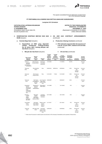 The original consolidated financial statements included hereinare in the Indonesian language.PT PERTAMINA HULU ENERGI DAN ENTITAS ANAK/AND SUBSIDIARIES Lampiran 5/12 ScheduleCATATAN ATAS LAPORAN KEUANGANKONSOLIDASIAN31 DESEMBER 2020(Dinyatakan dalam ribuan dolar AS, kecuali dinyatakan lain)NOTES TO THE CONSOLIDATEDFINANCIAL STATEMENTSDECEMBER 31, 2020(Expressed in thousands of US dollars,unless otherwise stated)2. KESEPAKATAN KONTRAK MINYAK DAN GASBUMI (lanjutan)2. OIL AND GAS CONTRACT ARRANGEMENTS(continued)a. Kontrak Bagi Hasil (lanjutan) a. Production Sharing Contracts (continued)ii. Kepemilikan di KBH yang diperolehsetelah berlakunya Undang-UndangNo. 22 tahun 2001, tentang Minyak danGas Bumi (lanjutan)ii. PSC interests acquired after the issuance ofLaw No. 22 year 2001, related to Oil and Gas(continued)1. Minyak dan Gas Bumi (lanjutan) 1. Oil and Gas (continued)Mitra UsahaKBH/PSCPartnersWilayahKerja/WorkingAreaWilayah/AreaTanggalEfektifKontrak/EffectiveDate ofContractTanggalMulaiProduksi/ProductionCommencementDateTanggalJatuh TempoKontrak/Expiry Dateof ContractPersentasePartisipasi/PercentageofParticipationProduksi/ProductionPeriodeKontrak/ContractPeriodVideoconIndonesiaNunukanBprl VenturesIndonesia BVBlok Nunukan/Nunukan Block*KalimantanTimur/EastKalimantan12/12/2004 - 11/12/2034 64,50% - 30 tahun/yearsTidak ada/NoneBlok Siak/SiakBlock*Riau 26/05/2014 28/05/2014 25/05/2034 100% Minyak dangasbumi/Oiland gas20 tahun/yearsTidak ada/NoneBlok Kampar/Kampar Block*Riau 01/01/2016 7/1993 01/01/2036 100% Minyak dangasbumi/Oiland gas20 tahun/yearsTidak ada/NoneBlok Randugunting/RanduguntingBlock*Jawa Tengah &Jawa Timur/Central & EastJava09/08/2007 - 08/08/2037 100% - 30 tahun/yearsKonsorsiumMurphy(Murphy Oil Corporation,InpexCorporationand PTTEPLtd.)Blok Semai II Offshore/Semai II Offshore BlockPapua Barat/West Papua13/11/2008 - 12/11/2038 15% - 30 tahun/yearsPetronasCarigali(WestGlagahKambuna)Sdn. Bhd.Blok WestGlagahKambuna/West GlagahKambuna Block*SumateraUtara/NorthSumatera30/11/2009 - 29/11/2039 40% - 30 tahun/YearsInpex BabarSelaruLimitedBlok BabarSelaru/BabarSelaru BlockMaluku LepasPantai/OffshoreMaluku21/11/2011 - 20/11/2041 15% Minyak dangasbumi/Oiland gas30 tahun/yearsTidak ada/NoneBlok Abar/ AbarBlock*Jawa BaratLepas Pantai/Offshore WestJava22/05/2015 - 22/05/2045 100% Minyak dangasbumi/Oiland gas30 tahun/Years* Entitas Anak Perusahaan ini adalah operator atas blok-blok ini/The Company%u2019s Subsidiaries are the operators of these blocks.Laporan ManajemenManagement ReportProfil PerusahaanCompany ProfileAnalisa & Diskusi ManajemenManagement Discussion & AnalysisIkhtisar 20202020 HighlightsPT Pertamina Hulu Energi2020 Laporan Tahunan TerintegrasiIntegrated Annual Report 692
