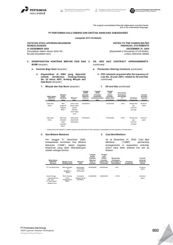 The original consolidated financial statements included hereinare in the Indonesian language.PT PERTAMINA HULU ENERGI DAN ENTITAS ANAK/AND SUBSIDIARIES Lampiran 5/13 ScheduleCATATAN ATAS LAPORAN KEUANGANKONSOLIDASIAN31 DESEMBER 2020(Dinyatakan dalam ribuan dolar AS, kecuali dinyatakan lain)NOTES TO THE CONSOLIDATEDFINANCIAL STATEMENTSDECEMBER 31, 2020(Expressed in thousands of US dollars,unless otherwise stated)2. KESEPAKATAN KONTRAK MINYAK DAN GASBUMI (lanjutan)2. OIL AND GAS CONTRACT ARRANGEMENTS(continued)a. Kontrak Bagi Hasil (lanjutan) a. Production Sharing Contracts (continued)ii. Kepemilikan di KBH yang diperolehsetelah berlakunya Undang-UndangNo. 22 tahun 2001, tentang Minyak danGas Bumi (lanjutan)ii. PSC interests acquired after the issuance ofLaw No. 22 year 2001, related to Oil and Gas(continued)1. Minyak dan Gas Bumi (lanjutan) 1. Oil and Gas (continued)Mitra UsahaKBH/PSCPartnersWilayahKerja/WorkingAreaWilayah/AreaTanggalEfektifKontrak/EffectiveDate ofContractTanggalMulaiProduksi/ProductionCommencementDateTanggalJatuhTempoKontrak/Expiry Dateof ContractPersentasePartisipasi/PercentageofParticipationProduksi/ProductionPeriodeKontrak/ContractPeriodTidak ada/NoneBlokAnggursi/AnggursiBlock*Utara JawaBarat LepasPantai/OffshoreNorth WestJava22/05/2015 - 22/05/2045 100% Minyak dangasbumi/Oiland gas30 tahun/YearsTidak ada/NoneBlok EastAmbalat/EastAmbalatBlock*KalimantanUtara/NorthKalimantan25/05/2016 - 25/05/2046 100% Minyak dangasbumi/Oiland gas30 tahun/years* Entitas Anak Perusahaan ini adalah operator atas blok-blok ini/The Company%u2019s Subsidiaries are the operators of these blocks2. Gas Metana Batubara 2. Coal Bed MethanePer tanggal 31 Desember 2020,kesepakatan kemitraan Gas MetanaBatubara (%u201cGMB%u201d) dalam kegiataneksplorasi yang telah ditandatanganiadalah sebagai berikut:As at December 31, 2020, Coal BedMethane (%u201cCBM%u201d) partnershiparrangements in exploration activitieswhich have been entered into are asfollows:Mitra UsahaKBH/PSCPartnersWilayah kerja/Working AreaWilayah/AreaTanggalEfektifKontrak/EffectiveDate ofContractTanggalJatuhTempoKontrak/Expiry Dateof ContractPersentasePartisipasi/Percentage ofParticipationProduksi/ProductionPeriodeKontrak/ContractPeriodPT Visi Multi Artha Blok SangattaII/Sangatta II BlockKalimantanTimur/EastKalimantan05/05/2009 04/05/2039 40% - 30 tahun/yearsArrow Energy(Tanjung Enim)Pte., Ltd.PT Bukit AsamMetana EnimBlok TanjungEnim/Tanjung EnimBlockSumateraSelatan/SouthSumatera04/08/2009 03/08/2039 27,5% - 30 tahun/yearsTata Kelola Perusahaan yang BaikGood Corporate GovernanceTanggung Jawab Sosial PerusahaanCorporate Social ResponsibilityLaporan Keuangan KonsolidasianConsolidated Financial ReportPT Pertamina Hulu Energi2020 Laporan Tahunan TerintegrasiIntegrated Annual Report 693