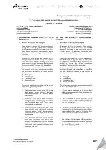The original consolidated financial statements included hereinare in the Indonesian language.PT PERTAMINA HULU ENERGI DAN ENTITAS ANAK/AND SUBSIDIARIES Lampiran 5/15 ScheduleCATATAN ATAS LAPORAN KEUANGANKONSOLIDASIAN31 DESEMBER 2020(Dinyatakan dalam ribuan dolar AS, kecuali dinyatakan lain)NOTES TO THE CONSOLIDATEDFINANCIAL STATEMENTSDECEMBER 31, 2020(Expressed in thousands of US dollars,unless otherwise stated)2. KESEPAKATAN KONTRAK MINYAK DAN GASBUMI (lanjutan)2. OIL AND GAS CONTRACT ARRANGEMENTS(continued)b. Kontrak Gross Split (%u201cGross Split%u201d) b. Gross Split Contracts (%u201cGross Split%u201d)Pada tanggal 13 Januari 2017, Peraturan MenteriEnergi dan Sumber Daya Mineral No. 08/2017tentang ketentuan-ketentuan pokok Kontrak BagiHasil Tanpa Mekanisme Pengembalian BiayaOperasi atau disebut sebagai KBH Gross Splitditerbitkan.Selanjutnya, pada tanggal 29 Agustus 2017,terdapat Peraturan Menteri Energi dan SumberDaya Mineral No. 52/2017 tentang Perubahanatas Peraturan Menteri Energi dan Sumber DayaMineral No. 08/2017 tentang KBH Gross Split.On January 13, 2017, the regulation of the Ministerof Energy and Mineral Resources No. 08/2017regarding principles of the Production SharingContract without Cost Recovery Mechanism, alsoknown as Gross Split PSC was issued.Furthermore, On August 29, 2017 the regulation ofthe Minister of Energy and Mineral ResourcesNo. 52/2017 for amandment of the regulation of theMinister of Energy and Mineral ResourcesNo. 08/2017 related with PSC Gross Split.Dalam KBH Gross Split, hasil produksi minyakdan gas bumi dibagi antara Pemerintah Indonesiadan Kontraktor berdasarkan 4 kriteria sebagaiberikut:1. Base Split2. Variable Split3. Progressive Split4. Diskresi MenteriIn Gross Split PSC the sharing of oil and gasproduction between the Government of Indonesiaand the Contractors is based on the following 4criterias:1. Base Split2. Variable Split3. Progressive Split4. Ministry DiscretionPemerintah juga telah mengatur hal-hal terkaitKBH Gross Split sebagai berikut :i. Rezim pajak yang berlaku untuk KBH GrossSplit adalah sesuai dengan ketentuanperundang-undangan di bidang pajakpenghasilan;ii. Kontraktor KBH Gross Split diwajibkanmengganti biaya investasi yang dikeluarkanoleh kontraktor KBH lama yang belummendapatkan penggantian;iii. Aset minyak dan gas bumi dari KBH lamayang dimiliki oleh Direktorat JenderalKekayaan Negara (%u201cDJKN%u201d) akan digunakanoleh kontraktor KBH Gross Split denganskema sewa.iv. Sewa dikenakan atas aset minyak dan gasbumi yang digunakan dan sudah costrecovery, kemudian nilai wajarnya dihitungberdasarkan Standar Penilaian Indonesiaoleh Penilai Publik, dikalikan tarif sewa yangditetapkan oleh DJKN.The Government has also arranged matters relatedto Gross Split PSC as folloi. The tax regime applicable to the Gross SplitPSC is in accordance with the provisions of theincome tax law;ii. The contractors of Gross Split PSC mustreimburse unrecovered investment costs to theold PSC contractors;iii. The oil and gas assets of the old PSC which arenow owned by the Directorate General of StateAssets (%u201cDJKN%u201d) are used by the Gross SplitPSC contractors based on lease scheme.iv. Leases are imposed on oil and gas assets thatare used and fully recovered, then the fair valueis appraised based on the Indonesian AppraisalStandard by the Public Appraiser, multiplied bythe rental rate set by DJKN.Tata Kelola Perusahaan yang BaikGood Corporate GovernanceTanggung Jawab Sosial PerusahaanCorporate Social ResponsibilityLaporan Keuangan KonsolidasianConsolidated Financial ReportPT Pertamina Hulu Energi2020 Laporan Tahunan TerintegrasiIntegrated Annual Report 695