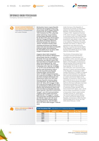 Laporan ManajemenManagement ReportProfil PerusahaanCompany ProfileAnalisa & Diskusi ManajemenManagement Discussion & AnalysisIkhtisar 20202020 HighlightsPT Pertamina Hulu Energi2020 Laporan Tahunan TerintegrasiIntegrated Annual Report 70DASAR HUKUM PENDIRIAN DAN PERUBAHAN TERAKHIRLegal Basis of Establishment and Latest ChangesBerdasarkan hukum negara Republik Indonesia dan Anggaran Dasar yang dimuat dalam Berita Negara Republik Indonesia No.62 tanggal 3 Agustus 1990 Tambahan No.2749, yang telah diubah seluruhnya sesuai UndangUndang Negara Republik Indonesia No.40 tahun 2007 yang dimuat dalam akta No.5 tanggal 04 Agustus 2008 yang dibuat di hadapan Marianne Vincentia Hamdani, SH, Notaris di Jakarta. Perubahan tersebut telah mendapat persetujuan dari Menteri Hukum dan Hak Asasi Manusia Republik Indonesia dalam Surat Keputusan No.AHU-69995.AH.01.02.Tahun 2008 tanggal 26 September 2008.Anggaran dasar telah mengalami beberapa kali perubahan sebagaimana dimuat dalam akta No.4 tanggal 5 November 2012 dan telah mendapat persetujuan dari Menteri Hukum dan Hak Asasi Manusia Republik Indonesia dalam Surat Keputusan No. AHU61643.AH.01.02.Tahun 2012 tanggal 3 Desember 2012, akta No.14 tanggal 10 Juli 2013 dan pemberitahuan telah diterima oleh Kementerian Hukum dan Hak Asasi Manusia Republik Indonesia dalam surat No.AHUAH.01.10-34801 tanggal 23 Agustus 2013, Akta No.39 tanggal 21 April 2016 dan telah mendapat persetujuan dari Kementerian Hukum dan Hak Asasi Manusia Republik Indonesia dalam surat Keputusan No.AHU-0009155.AH.01.02. Tahun 2016 tanggal 15 Mei 2016, Akta No.46 tanggal 30 April 2018 dan pemberitahuan perubahannya telah diterima oleh Kementerian Hukum dan Hak Asasi Manusia Republik Indonesia dalam surat No. AHU-AH.01.03-0213479 Tanggal 7 Juni 2018 serta perubahan Anggaran Dasar terakhir tercantum pada Akta No. 18 Tanggal 31 Januari 2020 yang telah mendapat persetujuan dari Menteri Hukum dan Hak Asasi Manusia Republik Indonesia dalam surat Keputusan No. AHU-0010803.AH.01.02 Tahun 2020 tanggal 7 Februari 2020.Under the laws of the Republic of Indonesia and Articles of Association stated in the State Gazette of the Republic of Indonesia Number 62 of 3 August 1990 , Supplement Number 2749, which has been changed entirely in accordance with Law of the Republic of Indonesia Number 40 of 2007. The amendment was stated in Deed Number 5 of 4 August 2008, which was made in the presence of Marianne Vincentia Hamdani, SH, Notary in Jakarta. The amendment was approved by the Minister of Justice and Human Rights of the Republic of Indonesia in Decree Number AHU-69995.AH.01.02 of 2008 dated 26 September 2008.The Articles of Association have undergone several amendments as published in Deed Number 4 of November 5, 2012, and were approved by the Minister of Justice and Human Rights of the Republic of Indonesia in Decree Number AHU-61643.AH.01.02 of 2012 dated December 3, 2012. Deed Number 14 of July 10, 2013 and notification were received by the Ministry of Justice and Human Rights of the Republic of Indonesia in letter number AHU-AH.01.10-34801 of August 23, 2013, Deed Number 39 of April 21, 2016 and was received by the Ministry of Justice and Human Rights of the Republic of Indonesia in letter Number AHU-0009155.AH.01.02 of 2016 dated May 15, 2016, Deed Number 46 dated April 30, 2018 and notification has been received by the Ministry of Justice and Human Rights of the Republic of Indonesia in letter Number AHUAH.01.03-0213479 dated June 7, 2018 and the latest amandments of Article of Association listed in deed number 18 dated January 31, 2020 which has received approval from Ministry of Justice and Human Rights of the Republic of Indonesia in letter Number AHU-0010803.AH.01.02 for the Year 2020 dated February 7, 2020.Informasi umum perusahaanCompany General InformationSKALA ORGANISASI [102-7]Organization Scale Anak Perusahaan PHE | Subsidiaries of PT Pertamina Hulu Energi Tahun | Years2020 57 51 62019 58 53 52018 58 53 52017 59 53 62016 57 51 6Jumlah | Total Dalam Negeri | Domestic Luar Negeri | Overseas