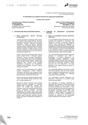 The original consolidated financial statements included hereinare in the Indonesian language.PT PERTAMINA HULU ENERGI DAN ENTITAS ANAK/AND SUBSIDIARIES Lampiran 5/20 ScheduleCATATAN ATAS LAPORAN KEUANGANKONSOLIDASIAN31 DESEMBER 2020(Dinyatakan dalam ribuan dolar AS, kecuali dinyatakan lain)NOTES TO THE CONSOLIDATEDFINANCIAL STATEMENTSDECEMBER 31, 2020(Expressed in thousands of US dollars,unless otherwise stated)3. IKHTISAR KEBIJAKAN AKUNTANSI PENTING 3. SUMMARY OF SIGNIFICANT ACCOUNTINGPOLICIESa. Dasar penyusunan laporan keuangankonsolidasiana. Basis of consolidated financial statementspreparationLaporan keuangan konsolidasian telah disusundan disajikan sesuai dengan Standar AkuntansiKeuangan di Indonesia (%u201cSAK%u201d), yang mencakupPernyataan Standar Akuntansi Keuangan(%u201cPSAK%u201d) dan Interpretasi Standar AkuntansiKeuangan (%u201cISAK%u201d) yang dikeluarkan oleh DewanStandar Akuntansi Keuangan Ikatan AkuntanIndonesia. Kebijakan ini telah diterapkan secarakonsisten terhadap seluruh tahun yang disajikan,kecuali jika dinyatakan lain.The consolidated financial statements have beenprepared and presented in accordance withIndonesian Financial Accounting Standards(%u201cFAS%u201d), which comprise the Statements ofFinancial Accounting Standards (%u201cSFAS%u201d) andInterpretations to Financial Accounting Standards(%u201cISAK%u201d) issued by the Financial Accounting Boardof the Indonesian Institute of Accountants andThese policies have been consistently applied toall years presented, unless otherwise stated.Laporan keuangan konsolidasian telah disusunsesuai dengan PSAK 1: Penyajian LaporanKeuangan. Laporan keuangan konsolidasian,kecuali untuk laporan arus kas konsolidasian,disusun berdasarkan basis akrual, menggunakandasar akuntansi biaya historis, kecuali untukbeberapa akun tertentu yang disajikanberdasarkan pengukuran lain sebagaimanadiuraikan dalam kebijakan akuntansi masingmasing akun tersebut.The consolidated financial statements have beenprepared in accordance with SFAS 1:Presentation of Financial Statements. Theconsolidated financial statements, exceptconsolidated statement of cash flows, have beenprepared on the accrual basis, using the historicalcost basis of accounting, except for certainaccounts which are measured on the basisdescribed in the related accounting policies forthose accounts.Laporan arus kas konsolidasian yang disajikandengan menggunakan metode langsung,menyajikan penerimaan dan pengeluaran kasdan setara kas yang diklasifikasikan ke dalamaktivitas operasi, investasi dan pendanaan.The consolidated statement of cash flows, whichhave been prepared using the direct method,present receipts and disbursements of cash andcash equivalents classified into operating,investing and financing activities.Laporan keuangan konsolidasian disajikan dalamribuan dolar Amerika Serikat (US$ atau dolarAS), kecuali dinyatakan lain.The consolidated financial statements arepresented in thousands of US dollars (US$),unless otherwise stated.Penyusunan laporan keuangan sesuai denganStandar Akuntansi Keuangan di Indonesiamengharuskan penggunaan estimasi danasumsi. Hal tersebut juga mengharuskanmanajemen untuk membuat pertimbangan dalamproses penerapan kebijakan akuntansiPerusahaan dan Entitas Anak. Area yangkompleks atau memerlukan tingkat pertimbanganyang lebih tinggi atau area dimana asumsi danestimasi dapat berdampak signifikan terhadaplaporan keuangan konsolidasian diungkapkan diCatatan 4.The preparation of financial statements inconformity with Indonesian Financial AccountingStandards requires the use of certain criticalaccounting estimates and assumptions. It alsorequires management to exercise its judgement inthe process of applying the Company%u2019s andSubsidiaries%u2019 accounting policies. The areasinvolving a higher degree of judgement orcomplexity, or areas where assumptions andestimates are significant to the consolidatedfinancial statements are disclosed in Note 4.Laporan ManajemenManagement ReportProfil PerusahaanCompany ProfileAnalisa & Diskusi ManajemenManagement Discussion & AnalysisIkhtisar 20202020 HighlightsPT Pertamina Hulu Energi2020 Laporan Tahunan TerintegrasiIntegrated Annual Report 700