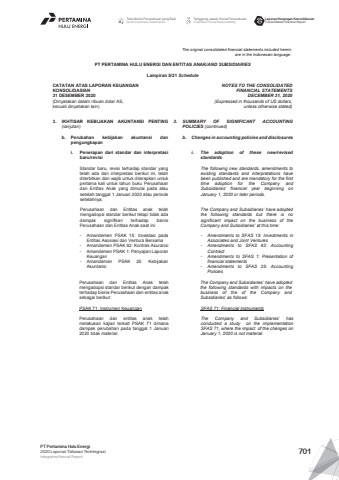 The original consolidated financial statements included hereinare in the Indonesian language.PT PERTAMINA HULU ENERGI DAN ENTITAS ANAK/AND SUBSIDIARIES Lampiran 5/21 ScheduleCATATAN ATAS LAPORAN KEUANGANKONSOLIDASIAN31 DESEMBER 2020(Dinyatakan dalam ribuan dolar AS, kecuali dinyatakan lain)NOTES TO THE CONSOLIDATEDFINANCIAL STATEMENTSDECEMBER 31, 2020(Expressed in thousands of US dollars,unless otherwise stated)3. IKHTISAR KEBIJAKAN AKUNTANSI PENTING(lanjutan)3. SUMMARY OF SIGNIFICANT ACCOUNTINGPOLICIES (continued)b. Perubahan kebijakan akuntansi danpengungkapanb. Changes in accounting policies and disclosuresi. Penerapan dari standar dan interpretasibaru/revisii. The adoption of these new/revisedstandardsStandar baru, revisi terhadap standar yangtelah ada dan interpretasi berikut ini, telahditerbitkan dan wajib untuk diterapkan untukpertama kali untuk tahun buku Perusahaandan Entitas Anak yang dimulai pada atausetelah tanggal 1 Januari 2020 atau periodesetelahnya.The following new standards, amendments toexisting standards and interpretations havebeen published and are mandatory for the firsttime adoption for the Company andSubsidiaries%u2019 financial year beginning onJanuary 1, 2020 or later periods.Perusahaan dan Entitas anak telahmengadopsi standar berikut tetapi tidak adadampak signifikan terhadap bisnisPerusahaan dan Entitas Anak saat ini:The Company and Subsidiaries%u2019 have adoptedthe following standards but there is nosignificant impact on the business of theCompany and Subsidiaries%u2019 at this time:- Amandemen PSAK 15: Investasi padaEntitas Asosiasi dan Ventura Bersama- Amandemen PSAK 62: Kontrak Asuransi- Amandemen PSAK 1: Penyajian LaporanKeuangan- Amandemen PSAK 25: KebijakanAkuntansi- Amendments to SFAS 15: Investments inAssociates and Joint Ventures- Amendments to SFAS 62: AccountingContract- Amendments to SFAS 1: Presentation offinancial statements- Amendments to SFAS 25: AccountingPoliciesPerusahaan dan Entitas Anak telahmengadopsi standar berikut dengan dampakterhadap bisnis Perusahaan dan entitas anaksebagai berikut:The Company and Subsidiaries%u2019 have adoptedthe following standards with impacts on thebusiness of the of the Company andSubsidiaries%u2019 as follows:PSAK 71: Instrumen Keuangan SFAS 71: Financial InstrumentsPerusahaan dan entitas anak telahmelakukan kajian terkait PSAK 71 dimanadampak perubahan pada tanggal 1 Januari2020 tidak material.The Company and Subsidiaries%u2019 hasconducted a study on the implementationSFAS 71, where the impact of the changes onJanuary 1, 2020 is not material.Tata Kelola Perusahaan yang BaikGood Corporate GovernanceTanggung Jawab Sosial PerusahaanCorporate Social ResponsibilityLaporan Keuangan KonsolidasianConsolidated Financial ReportPT Pertamina Hulu Energi2020 Laporan Tahunan TerintegrasiIntegrated Annual Report 701
