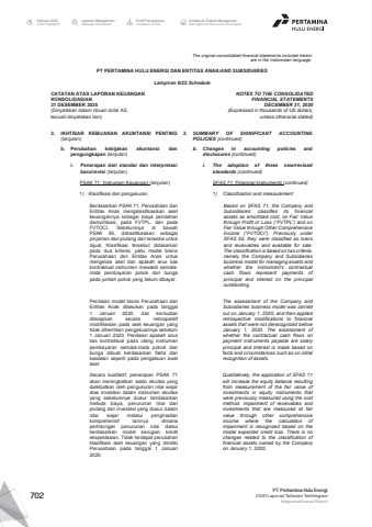 The original consolidated financial statements included hereinare in the Indonesian language.PT PERTAMINA HULU ENERGI DAN ENTITAS ANAK/AND SUBSIDIARIES Lampiran 5/22 ScheduleCATATAN ATAS LAPORAN KEUANGANKONSOLIDASIAN31 DESEMBER 2020(Dinyatakan dalam ribuan dolar AS, kecuali dinyatakan lain)NOTES TO THE CONSOLIDATEDFINANCIAL STATEMENTSDECEMBER 31, 2020(Expressed in thousands of US dollars,unless otherwise stated)3. IKHTISAR KEBIJAKAN AKUNTANSI PENTING(lanjutan)3. SUMMARY OF SIGNIFICANT ACCOUNTINGPOLICIES (continued)b. Perubahan kebijakan akuntansi danpengungkapan (lanjutan)b. Changes in accounting policies anddisclosures (continued)i. Penerapan dari standar dan interpretasibaru/revisi (lanjutan)i. The adoption of these new/revisedstandards (continued)PSAK 71: Instrumen Keuangan (lanjutan) SFAS 71: Financial Instruments (continued)1) Klasifikasi dan pengukuran 1) Classification and measurementBerdasarkan PSAK 71, Perusahaan danEntitas Anak mengklasifikasikan asetkeuangannya sebagai biaya perolehandiamortisasi, pada FVTPL, dan padaFVTOCI. Sebelumnya di bawahPSAK 55, diklasifikasikan sebagaipinjaman dan piutang dan tersedia untukdijual. Klasifikasi tersebut didasarkanpada dua kriteria, yaitu model bisnisPerusahaan dan Entitas Anak untukmengelola aset dan apakah arus kaskontraktual instrumen mewakili sematamata pembayaran pokok dan bungapada jumlah pokok yang belum dibayar.Based on SFAS 71, the Company andSubsidiaries%u2019 classifies its financialassets as amortized cost, on Fair Valuethrough Profit or Loss (%u201cFVTPL%u201d) and onFair Value through Other ComprehensiveIncome (%u201cFVTOCI%u201d). Previously underSFAS 55, they were classified as loansand receivables and available for sale.The classification is based on two criteria,namely the Company and Subsidiariesbusiness model for managing assets andwhether the instrument's contractualcash flows represent payments ofprincipal and interest on the principaloutstanding.Penilaian model bisnis Perusahaan danEntitas Anak dilakukan pada tanggal1 Januari 2020, dan kemudianditerapkan secara retrospektifmodifikasian pada aset keuangan yangtidak dihentikan pengakuannya sebelum1 Januari 2020. Penilaian apakah aruskas kontraktual pada utang instrumenpembayaran semata-mata pokok danbunga dibuat berdasarkan fakta dankeadaan seperti pada pengakuan awalaset.The assessment of the Company andSubsidiaries business model was carriedout on January 1, 2020, and then appliedretrospective modifications to financialassets that were not derecognized beforeJanuary 1, 2020. The assessment ofwhether the contractual cash flows onpayment instruments payable are solelyprincipal and interest is made based onfacts and circumstances such as on initialrecognition of assets.Secara kualitatif, penerapan PSAK 71akan meningkatkan saldo ekuitas yangdiakibatkan oleh pengukuran nilai wajaratas investasi dalam instrumen ekuitasyang sebelumnya diukur berdasarkanmetode biaya, penurunan nilai daripiutang dan investasi yang diukur dalamnilai wajar melalui penghasilankomprehensif lainnya dimanaperhitungan penurunan nilai diakuiberdasarkan model kerugian kreditekspektasian. Tidak terdapat perubahanklasifikasi aset keuangan yang dimilikiPerusahaan pada tanggal 1 Januari2020.Qualitatively, the application of SFAS 71will increase the equity balance resultingfrom measurement of the fair value ofinvestments in equity instruments thatwere previously measured using the costmethod, impairment of receivables andinvestments that are measured at fairvalue through other comprehensiveincome where the calculation ofimpairment is recognized based on themodel expected credit loss. There is nochanges related to the classification offinancial assets owned by the Companyon January 1, 2020.Laporan ManajemenManagement ReportProfil PerusahaanCompany ProfileAnalisa & Diskusi ManajemenManagement Discussion & AnalysisIkhtisar 20202020 HighlightsPT Pertamina Hulu Energi2020 Laporan Tahunan TerintegrasiIntegrated Annual Report 702