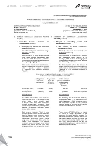 The original consolidated financial statements included hereinare in the Indonesian language.PT PERTAMINA HULU ENERGI DAN ENTITAS ANAK/AND SUBSIDIARIES Lampiran 5/24 ScheduleCATATAN ATAS LAPORAN KEUANGANKONSOLIDASIAN31 DESEMBER 2020(Dinyatakan dalam ribuan dolar AS, kecuali dinyatakan lain)NOTES TO THE CONSOLIDATEDFINANCIAL STATEMENTSDECEMBER 31, 2020(Expressed in thousands of US dollars,unless otherwise stated)3. IKHTISAR KEBIJAKAN AKUNTANSI PENTING(lanjutan)3. SUMMARY OF SIGNIFICANT ACCOUNTINGPOLICIES (continued)b. Perubahan kebijakan akuntansi danpengungkapan (lanjutan)b. Changes in accounting policies anddisclosures (continued)i. Penerapan dari standar dan interpretasibaru/revisi (lanjutan)i. The adoption of these new/revisedstandards (continued)PSAK 72: Pendapatan dari Kontrak denganPelanggan (lanjutan)SFAS 72 : Revenue from Contracts withCustomers (continued)Atas perubahan ini tidak terdapat dampakpada saldo ekuitas Perusahaan pada1 Januari 2020 dikarenakan perubahanhanya berupa reklasifikasi antara pendapatandan biaya langsung penjualanThis change has no impact on the Companyand Subsidiaries equity balance as ofJanuary 1, 2020 because the change just areclassification between direct sales revenueand direct selling expenses.Tabel berikut menunjukkan saldo beberapapos laporan keuangan dan laba rugi pada danuntuk periode yang berakhir31 Desember 2020 sebelum penerapanPSAK 72:The following table shows the balance ofseveral items on interim financial position andprofit or loss as at end or for the period endedDecember 31, 2020 before the application ofSFAS 72:Untuk laporan yang berakhir pada tanggal 31 Desember 2020/For the financial period ended 31 December 2020Sebagaimanadilaporkan/As reportedPenyesuaianPSAK 72/SFAS 72AdjustmentJumlah sebelumpenerapan PSAK 72/Amount beforeapplication ofSFAS 72Pendapatan usaha 1.901.434 (3.043) 1.898.391 RevenueBeban produksi (883.001) 3.043 (879.958) Production expensesPSAK 73: Sewa SFAS 73: LeasePerusahaan dan Entitas Anak melakukanpenerapan atas PSAK 73 secara efektif untuktahun buku yang dimulai pada1 Januari 2020, tetapi tidak menyajikankembali angka-angka komparatif untukperiode pelaporan sebelumnya sebagaimanadiizinkan berdasarkan ketentuan transisikhusus dalam standar.The Company and Subsidiaries effectivelyimplemented SFAS 73 for the financial yearbeginning January 1, 2020, but did not restatethe comparative figures for the previousreporting period as permitted under specialtransitional treatment in the standard.Bagi penyewa (lessee), PSAK 73 akanberdampak pada hampir seluruh sewa yangdiakui di laporan posisi keuangan, karenaperbedaan antara sewa operasi dan sewapembiayaan dihapuskan. Dalam standaryang baru, sebuah aset (hak guna atasbarang yang disewakan) dan liabilitaskeuangan untuk membayar sewa diakui.Pengecualian hanya terdapat pada sewajangka pendek dan aset yang bernilai rendah.For the lessees, SFAS 73 will have an impacton almost all leases recognised in thestatement of financial position, because thedifference between the operating leases andthe financial leases is written off. Under thenew standard, an asset (a right to lease theitem) and a financial liability to pay rent arerecognized. Exceptions are only for short-termleases and low-value assets.Laporan ManajemenManagement ReportProfil PerusahaanCompany ProfileAnalisa & Diskusi ManajemenManagement Discussion & AnalysisIkhtisar 20202020 HighlightsPT Pertamina Hulu Energi2020 Laporan Tahunan TerintegrasiIntegrated Annual Report 704