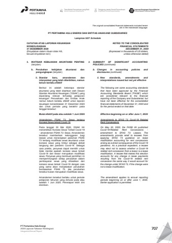 The original consolidated financial statements included hereinare in the Indonesian language.PT PERTAMINA HULU ENERGI DAN ENTITAS ANAK/AND SUBSIDIARIES Lampiran 5/27 ScheduleCATATAN ATAS LAPORAN KEUANGANKONSOLIDASIAN31 DESEMBER 2020(Dinyatakan dalam ribuan dolar AS, kecuali dinyatakan lain)NOTES TO THE CONSOLIDATEDFINANCIAL STATEMENTSDECEMBER 31, 2020(Expressed in thousands of US dollars,unless otherwise stated)3. IKHTISAR KEBIJAKAN AKUNTANSI PENTING(lanjutan)3. SUMMARY OF SIGNIFICANT ACCOUNTINGPOLICIES (continued)b. Perubahan kebijakan akuntansi danpengungkapan (lanjutan)b. Changes in accounting policies anddisclosures (continued)ii. Standar baru, amandemen daninterpretasi yang telah diterbitkan, namunbelum berlaku efektifii. New standards, amendments andinterpretations issued but not yet effectiveBerikut ini adalah beberapa standarakuntansi yang telah disahkan oleh DewanStandar Akuntansi Keuangan (%u201cDSAK%u201d) yangdipandang relevan terhadap pelaporankeuangan Perusahaan dan Entitas Anaknamun belum berlaku efektif untuk laporankeuangan konsolidasian 31 Desember 2020dan untuk periode yang berakhir padatanggal tersebut:The following are some accounting standardsthat have been approved by the FinancialAccounting Standards Board (\are considered relevant to the financialreporting of the Company and Subsidiaries%u2019 buthave not been effective for the consolidatedfinancial statements of December 31, 2020 andfor the period ended on that date:Mulai efektif pada atau setelah 1 Juni 2020Amandemen PSAK 73: Sewa tentangKonsesi Sewa terkait Covid-19Pada tanggal 30 Mei 2020, DSAK IAImenerbitkan Konsesi Sewa Terkait Covid-19- amandemen PSAK 73: Sewa. Amandementersebut memberikan kelonggaran bagilessee untuk menerapkan pedoman PSAK73 tentang modifikasi sewa akuntansi untukkonsesi sewa yang timbul sebagai akibatlangsung dari pandemi Covid-19. Sebagaicara praktis, penyewa dapat memilih untuktidak menilai apakah konsesi sewa terkaitCovid-19 dari lessor merupakan modifikasisewa. Penyewa yang membuat pemilihan inimemperhitungkan setiap perubahan dalampembayaran sewa yang dihasilkan darikonsesi sewa terkait Covid-19 dengan carayang sama akan menjelaskan perubahanberdasarkan PSAK 73, jika perubahantersebut bukan merupakan modifikasi sewa.Effective beginning on or after June 1, 2020Amendments to SFAS 73: Covid-19 RelatedRent ConcessionsOn May 30, 2020, the FASB IAI publishedCovid-19-Related Rent Concessions -amendment to SFAS 73: Leases. Theamendments provide relief to lessees fromapplying SFAS 73 guidance on leasemodification accounting for rent concessionsarising as a direct consequence of the Covid-19pandemic. As a practical expedient, a lesseemay elect not to assess whether a Covid-19related rent concession from a lessor is a leasemodification. A lessee that makes this electionaccounts for any change in lease paymentsresulting from the Covid-19 related rentconcession the same way it would account forthe change under SFAS 73, if the change werenot a lease modification.Amandemen tersebut berlaku untuk periodepelaporan tahunan yang dimulai pada atausetelah 1 Juni 2020. Penerapan lebih dinidiizinkan.The amendment applies to annual reportingperiods beginning on or after June 1, 2020.Earlier application is permitted.Tata Kelola Perusahaan yang BaikGood Corporate GovernanceTanggung Jawab Sosial PerusahaanCorporate Social ResponsibilityLaporan Keuangan KonsolidasianConsolidated Financial ReportPT Pertamina Hulu Energi2020 Laporan Tahunan TerintegrasiIntegrated Annual Report 707