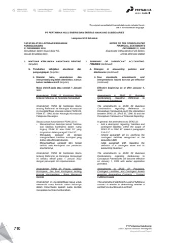 The original consolidated financial statements included hereinare in the Indonesian language.PT PERTAMINA HULU ENERGI DAN ENTITAS ANAK/AND SUBSIDIARIES Lampiran 5/30 ScheduleCATATAN ATAS LAPORAN KEUANGANKONSOLIDASIAN31 DESEMBER 2020(Dinyatakan dalam ribuan dolar AS, kecuali dinyatakan lain)NOTES TO THE CONSOLIDATEDFINANCIAL STATEMENTSDECEMBER 31, 2020(Expressed in thousands of US dollars,unless otherwise stated)3. IKHTISAR KEBIJAKAN AKUNTANSI PENTING(lanjutan)3. SUMMARY OF SIGNIFICANT ACCOUNTINGPOLICIES (continued)b. Perubahan kebijakan akuntansi danpengungkapan (lanjutan)b. Changes in accounting policies anddisclosures (continued)ii. Standar baru, amandemen daninterpretasi yang telah diterbitkan, namunbelum berlaku efektif (lanjutan)ii. New standards, amendments andinterpretations issued but not yet effective(continued)Mulai efektif pada atau setelah 1 Januari2022Effective beginning on or after January 1,2022Amandemen PSAK 22: Kombinasi Bisnistentang Referensi ke Kerangka KonseptualAmendments to SFAS 22: BusinessCombinations regarding Reference toConceptual FrameworksAmandemen PSAK 22 Kombinasi Bisnistentang Referensi ke Kerangka Konseptualini mengklarifikasi interaksi antara PSAK 22,PSAK 57, ISAK 30 dan Kerangka KonseptualPelaporan Keuangan.The amendments to SFAS 22 BusinessCombinations regarding Reference toConceptual Frameworks clarify the interactionsbetween SFAS 22, SFAS 57, ISAK 30 and theConceptual Framework of Financial Reporting.Secara umum Amandemen PSAK 22 ini: In general, the amendments to SFAS 22:%u2022 Menambahkan deskripsi terkait %u201cliabilitasdan liabilitas kontinjensi dalam ruanglingkup PSAK 57 atau ISAK 30%u201d yangdinyatakan dalam paragraf 21A-21C%u2022 Mengubah paragraf 23 denganmengklarifikasi liabilitas kontinjesi yangdiakui pada tanggal akuisisi.%u2022 Menambahkan paragraf 23A terkaitdefinisi aset kontinjensi dan perlakuanakuntansinya%u2022 Add a description regarding %u201cliabilities andcontingent liabilities within the scope ofSFAS 57 or ISAK 30%u201d stated in paragraphs21A-21C.%u2022 Amend paragraph 23 by clarifying thecontingent liabilities recognized at theacquisition date%u2022 Adds paragraph 23A regarding thedefinition of a contingent asset and itsaccounting treatmentAmandemen PSAK 22 Kombinasi Bisnistentang Referensi ke Kerangka Konseptualini berlaku efektif pada 1 Januari 2022dengan penerapan dini diperkenankan.The amendments to SFAS 22 BusinessCombinations regarding References toConceptual Frameworks will become effectiveon January 1, 2022 with earlier applicationpermitted.Amandemen PSAK 57: Provisi, LiabilitasKontinjensi, dan Aset Kontinjensi tentangKontrak Memberatkan - Biaya MemenuhiKontrakAmendments to SFAS 57: Provisions,Contingent Liabilities, and Contingent Assetsregarding Aggravating Contracts - ContractFulfillment CostsAmandemen ini mengklarifikasi biaya untukmemenuhi suatu kontrak dalam kaitannyadalam menentukan apakah suatu kontrakmerupakan kontrak memberatkan.This amendment clarifies the cost of fulfilling acontract in relation to determining whether acontract is a burdensome contract.Laporan ManajemenManagement ReportProfil PerusahaanCompany ProfileAnalisa & Diskusi ManajemenManagement Discussion & AnalysisIkhtisar 20202020 HighlightsPT Pertamina Hulu Energi2020 Laporan Tahunan TerintegrasiIntegrated Annual Report 710