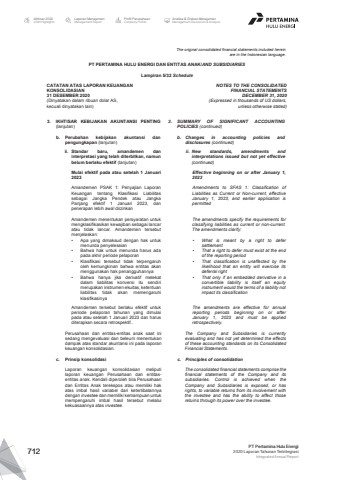 The original consolidated financial statements included hereinare in the Indonesian language.PT PERTAMINA HULU ENERGI DAN ENTITAS ANAK/AND SUBSIDIARIES Lampiran 5/32 ScheduleCATATAN ATAS LAPORAN KEUANGANKONSOLIDASIAN31 DESEMBER 2020(Dinyatakan dalam ribuan dolar AS, kecuali dinyatakan lain)NOTES TO THE CONSOLIDATEDFINANCIAL STATEMENTSDECEMBER 31, 2020(Expressed in thousands of US dollars,unless otherwise stated)3. IKHTISAR KEBIJAKAN AKUNTANSI PENTING(lanjutan)3. SUMMARY OF SIGNIFICANT ACCOUNTINGPOLICIES (continued)b. Perubahan kebijakan akuntansi danpengungkapan (lanjutan)b. Changes in accounting policies anddisclosures (continued)ii. Standar baru, amandemen daninterpretasi yang telah diterbitkan, namunbelum berlaku efektif (lanjutan)ii. New standards, amendments andinterpretations issued but not yet effective(continued)Mulai efektif pada atau setelah 1 Januari2023Effective beginning on or after January 1,2023Amandemen PSAK 1: Penyajian LaporanKeuangan tentang Klasifikasi Liabilitassebagai Jangka Pendek atau JangkaPanjang efektif 1 Januari 2023, danpenerapan lebih awal diizinkanAmendments to SFAS 1: Classification ofLiabilities as Current or Non-current, effectiveJanuary 1, 2023, and earlier application ispermittedAmandemen menentukan persyaratan untukmengklasifikasikan kewajiban sebagai lancaratau tidak lancar. Amandemen tersebutmenjelaskan:The amendments specify the requirements forclassifying liabilities as current or non-current.The amendments clarify:%u2022 Apa yang dimaksud dengan hak untukmenunda penyelesaian%u2022 Bahwa hak untuk menunda harus adapada akhir periode pelaporan%u2022 Klasifikasi tersebut tidak terpengaruholeh kemungkinan bahwa entitas akanmenggunakan hak penangguhannya%u2022 Bahwa hanya jika derivatif melekatdalam liabilitas konversi itu sendirimerupakan instrumen ekuitas, ketentuanliabilitas tidak akan memengaruhiklasifikasinya%u2022 What is meant by a right to defersettlement%u2022 That a right to defer must exist at the endof the reporting period%u2022 That classification is unaffected by thelikelihood that an entity will exercise itsdeferral right%u2022 That only if an embedded derivative in aconvertible liability is itself an equityinstrument would the terms of a liability notimpact its classificationAmandemen tersebut berlaku efektif untukperiode pelaporan tahunan yang dimulaipada atau setelah 1 Januari 2023 dan harusditerapkan secara retrospektif..The amendments are effective for annualreporting periods beginning on or afterJanuary 1, 2023 and must be appliedretrospectively.Perusahaan dan entitas-entitas anak saat inisedang mengevaluasi dan beleum menentukandampak atas standar akuntansi ini pada laporankeuangan konsolidasian.The Company and Subsidiaries is currentlyevaluating and has not yet determined the effectsof these accounting standards on its ConsolidatedFinancial Statements.c. Prinsip konsolidasi c. Principles of consolidationLaporan keuangan konsolidasian meliputilaporan keuangan Perusahaan dan entitasentitas anak. Kendali diperoleh bila Perusahaandan Entitas Anak terekspos atau memiliki hakatas imbal hasil variabel dari keterlibatannyadengan investee dan memiliki kemampuan untukmempengaruhi imbal hasil tersebut melaluikekuasaannya atas investee.The consolidated financial statements comprise thefinancial statements of the Company and itssubsidiaries. Control is achieved when theCompany and Subsidiaries is exposed, or hasrights, to variable returns from its involvement withthe investee and has the ability to affect thosereturns through its power over the investee.Laporan ManajemenManagement ReportProfil PerusahaanCompany ProfileAnalisa & Diskusi ManajemenManagement Discussion & AnalysisIkhtisar 20202020 HighlightsPT Pertamina Hulu Energi2020 Laporan Tahunan TerintegrasiIntegrated Annual Report 712