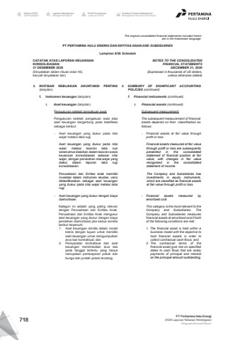 The original consolidated financial statements included hereinare in the Indonesian language.PT PERTAMINA HULU ENERGI DAN ENTITAS ANAK/AND SUBSIDIARIES Lampiran 5/38 ScheduleCATATAN ATAS LAPORAN KEUANGANKONSOLIDASIAN31 DESEMBER 2020(Dinyatakan dalam ribuan dolar AS, kecuali dinyatakan lain)NOTES TO THE CONSOLIDATEDFINANCIAL STATEMENTSDECEMBER 31, 2020(Expressed in thousands of US dollars,unless otherwise stated)3. IKHTISAR KEBIJAKAN AKUNTANSI PENTING(lanjutan)3. SUMMARY OF SIGNIFICANT ACCOUNTINGPOLICIES (continued)f. Instrumen keuangan (lanjutan) f. Financial instruments (continued)i. Aset keuangan (lanjutan) i. Financial assets (continued)Pengukuran setelah pengakuan awal Subsequent measurementPengukuran setelah pengakuan awal atasaset keuangan bergantung pada klasifikasisebagai berikut:The subsequent measurement of financialassets depends on their classification asfollows:- Aset keuangan yang diukur pada nilaiwajar melalui laba rugi- Financial assets at fair value throughprofit or lossAset keuangan yang diukur pada nilaiwajar melalui laporan laba rugiselanjutnya disajikan dalam laporan posisikeuangan konsolidasian sebesar nilaiwajar, dengan perubahan nilai wajar yangdiakui dalam laporan laba rugikonsolidasian.Financial assets measured at fair valuethrough profit or loss are subsequentlypresented in the consolidatedstatement of financial position at fairvalue, with changes in fair valuerecognized in the consolidatedstatement of income.Perusahaan dan Entitas anak memilikiinvestasi dalam instrumen ekuitas, yangdiklasifikasikan sebagai aset keuanganyang diukur pada nilai wajar melalui labarugiThe Company and Subsidiaries hasinvestments in equity instruments,which are classified as financial assetsat fair value through profit or loss.- Aset keuangan yang diukur dengan biayadiamortisasi- Financial assets measured byamortized costKategori ini adalah yang paling relevandengan Perusahaan dan Entitas Anak.Perusahaan dan Entitas Anak mengukuraset keuangan yang diukur dengan biayaperolehan diamortisasi jika kedua kondisiberikut terpenuhi:This category is the most relevant to theCompany and Subsidiaries. TheCompany and Subsidiaries measuresfinancial assets at amortised cost if bothof the following conditions are met:1. Aset keuangan dimiliki dalam modelbisnis dengan tujuan untuk memilikiaset keuangan untuk mengumpulkanarus kas kontraktual, dan2. Persyaratan kontraktual dari asetkeuangan menimbulkan arus kaspada tanggal tertentu yang hanyamerupakan pembayaran pokok danbunga dari jumlah pokok terutang.1. The financial asset is held within abusiness model with the objective tohold financial assets in order tocollect contractual cash flows; and2. The contractual terms of thefinancial asset give rise on specifieddates to cash flows that are solelypayments of principal and intereston the principal amount outstanding.Laporan ManajemenManagement ReportProfil PerusahaanCompany ProfileAnalisa & Diskusi ManajemenManagement Discussion & AnalysisIkhtisar 20202020 HighlightsPT Pertamina Hulu Energi2020 Laporan Tahunan TerintegrasiIntegrated Annual Report 718