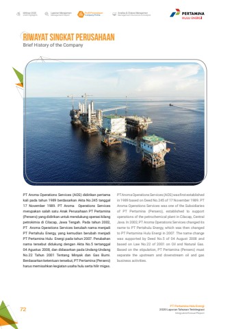 Laporan ManajemenManagement ReportProfil PerusahaanCompany ProfileAnalisa & Diskusi ManajemenManagement Discussion & AnalysisIkhtisar 20202020 HighlightsPT Pertamina Hulu Energi2020 Laporan Tahunan TerintegrasiIntegrated Annual Report 72RIWAYAT SINGKAT PERUSAHAANBrief History of the CompanyPT Aroma Operations Services (AOS) didirikan pertama kali pada tahun 1989 berdasarkan Akta No.245 tanggal 17 November 1989. PT Aroma Operations Services merupakan salah satu Anak Perusahaan PT Pertamina (Persero) yang didirikan untuk mendukung operasi kilang petrokimia di Cilacap, Jawa Tengah. Pada tahun 2002, PT Aroma Operations Services berubah nama menjadi PT Pertahulu Energy, yang kemudian berubah menjadi PT Pertamina Hulu Energi pada tahun 2007. Perubahan nama tersebut didukung dengan Akta No.5 tertanggal 04 Agustus 2008, dan didasarkan pada Undang-Undang No.22 Tahun 2001 Tentang Minyak dan Gas Bumi. Berdasarkan ketentuan tersebut, PT Pertamina (Persero) harus memisahkan kegiatan usaha hulu serta hilir migas. PT Aroma Operations Services (AOS) was first established in 1989 based on Deed No.245 of 17 November 1989. PT Aroma Operations Services was one of the Subsidiaries of PT Pertamina (Persero), established to support operations of the petrochemical plant in Cilacap, Central Java. In 2002, PT Aroma Operations Services changed its name to PT Pertahulu Energy, which was then changed to PT Pertamina Hulu Energi in 2007. The name change was supported by Deed No.5 of 04 August 2008 and based on Law No.22 of 2001 on Oil and Natural Gas. Based on the stipulation, PT Pertamina (Persero) must separate the upstream and downstream oil and gas business activities.