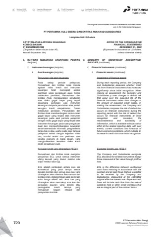 The original consolidated financial statements included hereinare in the Indonesian language.PT PERTAMINA HULU ENERGI DAN ENTITAS ANAK/AND SUBSIDIARIES Lampiran 5/40 ScheduleCATATAN ATAS LAPORAN KEUANGANKONSOLIDASIAN31 DESEMBER 2020(Dinyatakan dalam ribuan dolar AS, kecuali dinyatakan lain)NOTES TO THE CONSOLIDATEDFINANCIAL STATEMENTSDECEMBER 31, 2020(Expressed in thousands of US dollars,unless otherwise stated)3. IKHTISAR KEBIJAKAN AKUNTANSI PENTING(lanjutan)3. SUMMARY OF SIGNIFICANT ACCOUNTINGPOLICIES (continued)f. Instrumen keuangan (lanjutan) f. Financial instruments (continued)i. Aset keuangan (lanjutan) i. Financial assets (continued)Penurunan nilai aset keuangan Impairment of financial assetsPada setiap periode pelaporan,Perusahaan dan Entitas Anak menilaiapakah risiko kredit dari instrumenkeuangan telah meningkat secarasignifikan sejak pengakuan awal. Ketikamelakukan penilaian, Perusahaan danEntitas Anak menggunakan perubahanatas risiko gagal bayar yang terjadisepanjang perkiraan usia instrumenkeuangan daripada perubahan atas jumlahkerugian kredit ekspektasian. Dalammelakukan penilaian, Perusahaan danEntitas Anak membandingkan antara risikogagal bayar yang terjadi atas instrumenkeuangan pada saat periode pelaporandengan risiko gagal bayar yang terjadi atasinstrumen keuangan pada saat pengakuanawal dan mempertimbangkan kewajaranserta ketersediaan informasi, yang tersediatanpa biaya atau usaha pada saat tanggalpelaporan terkait dengan kejadian masalalu, kondisi terkini dan perkiraan ataskondisi ekonomi di masa depan, yangmengindikasikan kenaikan risiko kreditsejak pengakuan awal.During each reporting period, the Companyand Subsidiaries assesses whether creditrisk from financial instruments has increasedsignificantly since initial recognition. Whenmaking an assessment, the Company andSubsidiaries p uses changes in default riskthat occur over the expected life of thefinancial instrument rather than changes inthe amount of expected credit losses. Inmaking the assessment, the Company andSubsidiaries compares the risk of default thatoccurs on financial instruments during thereporting period with the risk of default thatoccurs for financial instruments at initialrecognition and considers thereasonableness and availability ofinformation, which is available without cost oreffort at the related reporting date. with pastevents, current conditions and forecasts offuture economic conditions, which indicate anincrease in credit risk since initial recognition.Kerugian kredit yang diharapkan (\Expected Credit Loss (\Perusahaan dan Entitas Anak mengakuipenyisihan ECL untuk semua instrumenutang kecuali yang diukur melalui nilaiwajar melalui laba rugi.The Company and Subsidiaries recognizeECL allowance for all debt instruments exceptthose measured at fair value through profit orloss.ECL adalah perbedaan antara arus kaskontraktual yang jatuh tempo sesuaidengan kontrak dan semua arus kas yangdiharapkan akan diterima Perusahaan danEntitas Anak, didiskontokan pada perkiraansuku bunga efektif asli. Arus kas yangdiharapkan akan mencakup arus kas daripenjualan agunan yang dimiliki ataupeningkatan kredit lainnya yangmerupakan bagian integral daripersyaratan kontrak.ECL is the difference between contractualcash flows maturing in accordance with thecontract and all cash flows that are expectedto be received by the Company andSubsidiaries, discounted at the estimatedoriginal effective interest rate. Expected cashflows will include cash flow from the sale ofcollateral held or other credit increases thatare an integral part of the contract terms.Laporan ManajemenManagement ReportProfil PerusahaanCompany ProfileAnalisa & Diskusi ManajemenManagement Discussion & AnalysisIkhtisar 20202020 HighlightsPT Pertamina Hulu Energi2020 Laporan Tahunan TerintegrasiIntegrated Annual Report 720