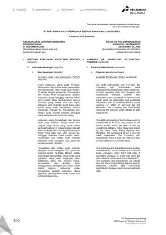 The original consolidated financial statements included hereinare in the Indonesian language.PT PERTAMINA HULU ENERGI DAN ENTITAS ANAK/AND SUBSIDIARIES Lampiran 5/42 ScheduleCATATAN ATAS LAPORAN KEUANGANKONSOLIDASIAN31 DESEMBER 2020(Dinyatakan dalam ribuan dolar AS, kecuali dinyatakan lain)NOTES TO THE CONSOLIDATEDFINANCIAL STATEMENTSDECEMBER 31, 2020(Expressed in thousands of US dollars,unless otherwise stated)3. IKHTISAR KEBIJAKAN AKUNTANSI PENTING(lanjutan)3. SUMMARY OF SIGNIFICANT ACCOUNTINGPOLICIES (continued)f. Instrumen keuangan (lanjutan) f. Financial instruments (continued)i. Aset keuangan (lanjutan) i. Financial assets (continued)Kerugian kredit yang diharapkan (\(lanjutan)Expected Credit Loss (\Untuk instrumen utang pada FVTOCI,Perusahaan dan Entitas Anak menerapkanpenyederhanaan risiko kredit yang rendah.Di setiap tanggal pelaporan, Perusahaandan Entitas Anak mengevaluasi apakahinstrumen utang dianggap memiliki kredityang rendah risiko menggunakan semuainformasi yang masuk akal dan dapatdidukung yang tersedia tanpa biaya atauusaha yang tidak semestinya. Dalammelakukan evaluasi itu, Perusahaan danEntitas Anak menilai kembali peringkatkredit eksternal dari instrumen utang.For debt instruments with FVTOCI, theCompany and Subsidiaries haveimplemented a simplification of low credit risk.At each reporting date, the Company andSubsidiaries evaluate whether debtinstruments are considered to have low-riskcredit using all reasonable and supportedinformation that is available without undueexpense or effort. In carrying out theevaluation, the Company and Subsidiariesreassess the external credit ratings of debtinstrumentsInstrumen utang Perusahaan dan EntitasAnak pada FVTOCI hanya terdiri dariobligasi yang dikutip yang dinilai dalamperingkat kategori investasi teratas (SangatBaik dan Baik) oleh Lembaga PemeringkatKredit Yang Baik dan, oleh karena itu,dianggap investasi kredit rendah risiko.Perusahaan dan Entitas Anak memilikikebijakan untuk mengukur ECL pada haltersebut secara 12 bulan.The debt instruments of the Company and itsSubsidiaries at FVTOCI only consist of thebonds quoted which are rated in the topinvestment category (Very Good and Good)by the Good Credit Rating Agency and,therefore, are considered to be a low-riskcredit investment. The Company andSubsidiaries have a policy to measure ECLon this matter on a 12-month basis.Perusahaan dan Entitas Anak memilikikebijakan untuk mengukur ECL pada haltersebut secara 12 bulan. Namun, ketikatelah terjadi peningkatan risiko kredit yangsignifikan sejak awal, tunjangan akandidasarkan pada ECL seumur hidup.Perusahaan dan Entitas Anakmenggunakan peringkat dari Good CreditRating Agency, keduanya untukmenentukan apakah instrumen utangsignifikan meningkatkan risiko kredit danmemperkirakan ECL.The Company and Subsidiaries have a policyto measure ECL on this matter on a 12-monthbasis. However, when there has been asignificant increase in credit risk from thestart, benefits will be based on a lifetime ECL.The Company and Subsidiaries use ratingsfrom the Good Credit Rating Agency, both todetermine whether debt instrumentssignificantly increase credit risk and estimateECL.Laporan ManajemenManagement ReportProfil PerusahaanCompany ProfileAnalisa & Diskusi ManajemenManagement Discussion & AnalysisIkhtisar 20202020 HighlightsPT Pertamina Hulu Energi2020 Laporan Tahunan TerintegrasiIntegrated Annual Report 722