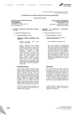 The original consolidated financial statements included hereinare in the Indonesian language.PT PERTAMINA HULU ENERGI DAN ENTITAS ANAK/AND SUBSIDIARIES Lampiran 5/46 ScheduleCATATAN ATAS LAPORAN KEUANGANKONSOLIDASIAN31 DESEMBER 2020(Dinyatakan dalam ribuan dolar AS, kecuali dinyatakan lain)NOTES TO THE CONSOLIDATEDFINANCIAL STATEMENTSDECEMBER 31, 2020(Expressed in thousands of US dollars,unless otherwise stated)3. IKHTISAR KEBIJAKAN AKUNTANSI PENTING(lanjutan)3. SUMMARY OF SIGNIFICANT ACCOUNTINGPOLICIES (continued)f. Instrumen keuangan (lanjutan) f. Financial instruments (continued)ii. Liabilitas keuangan (lanjutan) ii. Financial liabilities (continued)- Liabilitas keuangan pada biayaperolehan diamortisasi- Financial liabilities at amortized costSetelah pengakuan awal, liabilitaskeuangan yang diukur pada biayaperolehan diamortisasi yang dikenakanbunga selanjutnya diukur pada biayaperolehan diamortisasi denganmenggunakan metode SBE. Padatanggal pelaporan, biaya bunga yangmasih harus dibayar dicatat secaraterpisah dari pokok pinjaman terkaitdalam bagian liabilitas lancar.Keuntungan dan kerugian diakui dalamlaporan laba rugi dan penghasilankomprehensif lain konsolidasian ketikaliabilitas dihentikan pengakuannya sertamelalui proses amortisasi menggunakanmetode SBE.After initial recognition, interest-bearingloans and borrowings are subsequentlymeasured at cost using the EIR method. Atthe reporting date, the accrued interest isrecorded separately from the respectiveprincipal loans as part of current liabilities.Gains and losses are recognized in theconsolidated statement of profit or loss andother comprehensive income when theliabilities are derecognized as well asthrough the amortization process using theEIR method.Penghentian pengakuan DerecognitionKetika sebuah liabilitas keuangan ditukardengan liabilitas keuangan lain dari pemberipinjaman yang sama atas persyaratan yangsecara substansial berbeda, atau bilapersyaratan dari liabilitas keuangan tersebutsecara substansial dimodifikasi, pertukaranatau modifikasi persyaratan tersebut dicatatsebagai penghentian pengakuan liabilitaskeuangan awal dan pengakuan liabilitaskeuangan baru, dan selisih antara nilaitercatat masing-masing liabilitas keuangantersebut diakui dalam laporan laba rugi danpenghasilan komprehensif lain konsolidasian.When an existing financial liability is replacedby another from the same lender onsubstantially different terms, or the terms of anexisting liability are substantially modified, suchan exchange or modification is treated as aderecognition of the original liability and therecognition of a new liability, and the differencein the respective carrying amounts isrecognized in the consolidated statement ofprofit or loss and other comprehensive income.Liabilitas keuangan dihentikan pengakuannyapada saat liabilitas tersebut dihentikan ataudibatalkan atau kadaluarsa.A financial liability is derecognized when theobligation under the liability is discharged orcancelled or has expired.Pengukuran setelah pengakuan awal(lanjutan)Subsequent measurement (continued)Laporan ManajemenManagement ReportProfil PerusahaanCompany ProfileAnalisa & Diskusi ManajemenManagement Discussion & AnalysisIkhtisar 20202020 HighlightsPT Pertamina Hulu Energi2020 Laporan Tahunan TerintegrasiIntegrated Annual Report 726